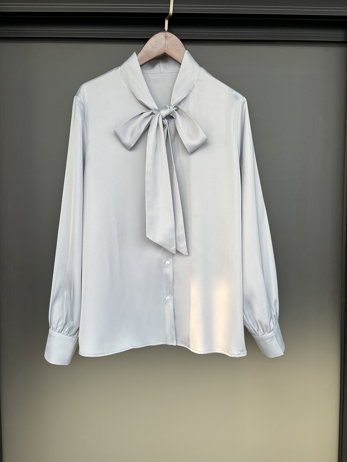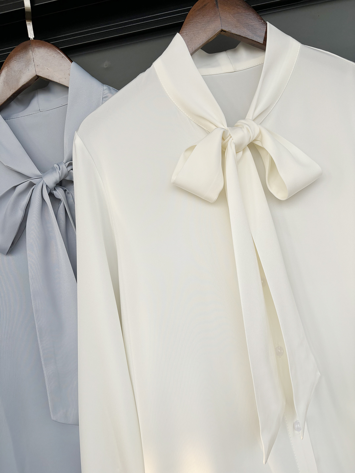 系带蝴蝶结衬衫女醋酸缎面雪纺衫春秋款 新通勤百搭基础打底上衣