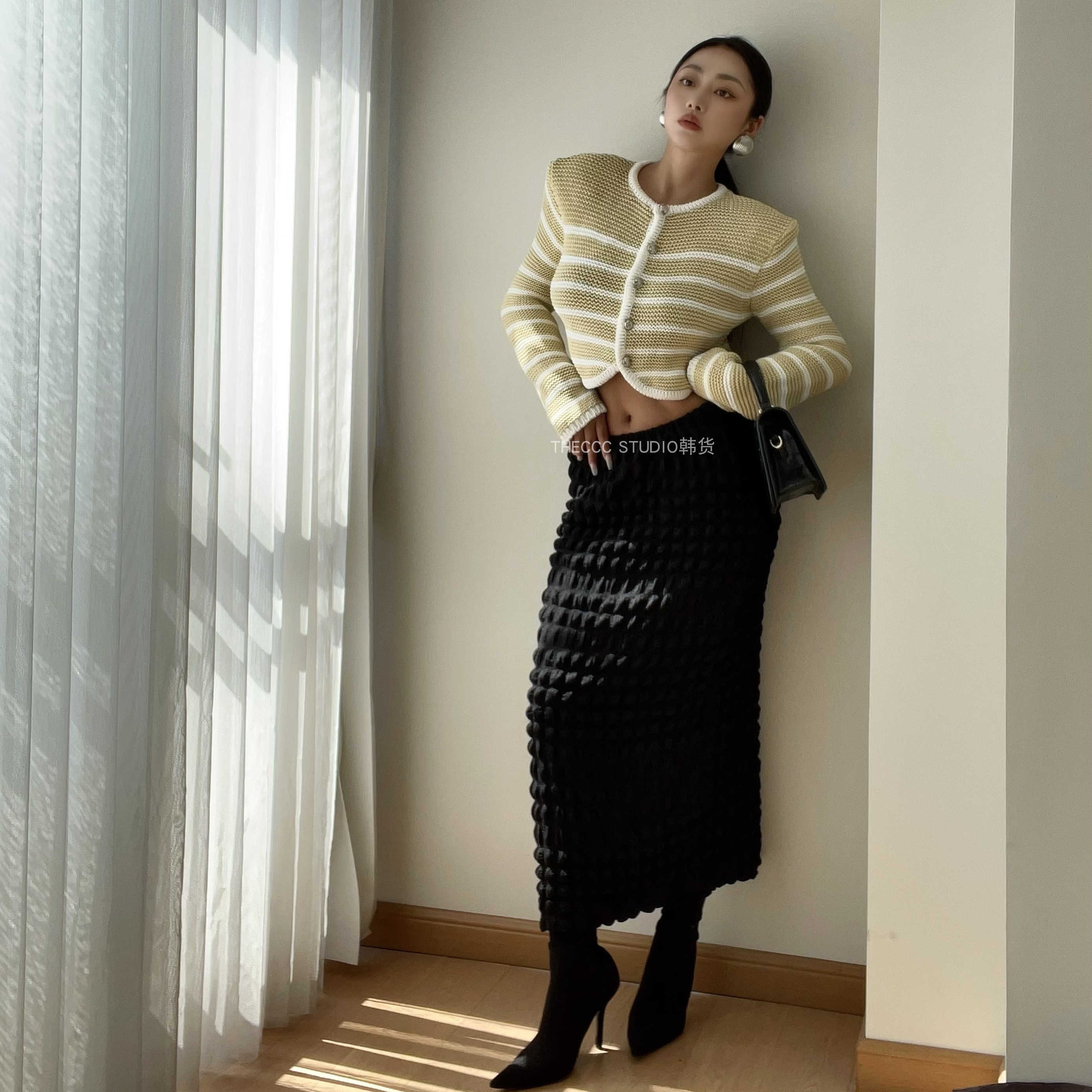 现 韩货代购 圆领长袖拼色条纹短款针织短外套