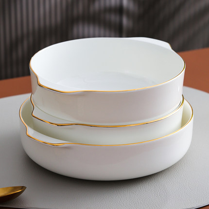金边唐山骨瓷盘子碟子日式饭盘汤盘陶瓷手柄酒店餐具家用双耳汤碗