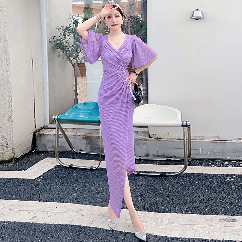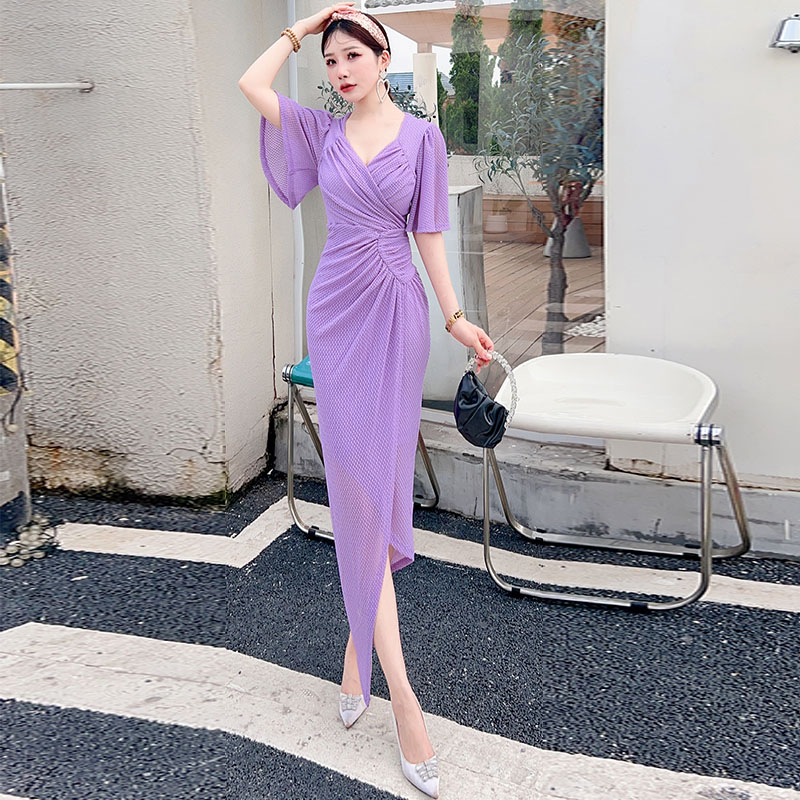 性感包臀纯色褶皱修身连衣裙女夏
