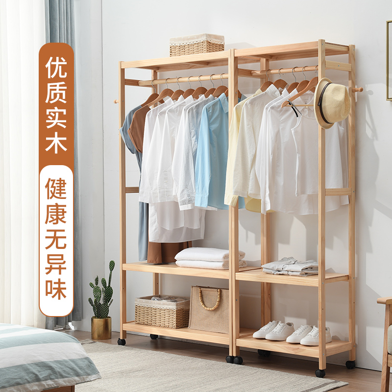 实木衣架卧室家用挂衣架落地简易衣帽架木质结实双层立式衣服架子