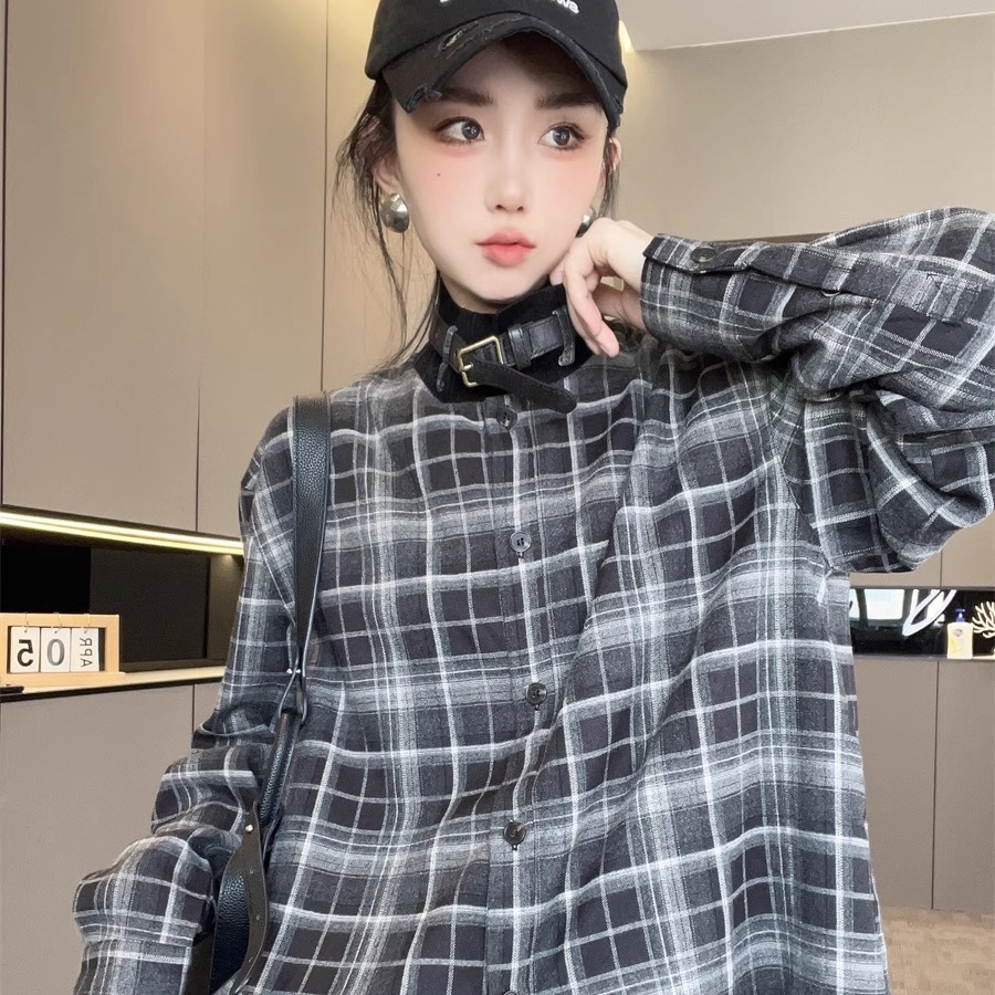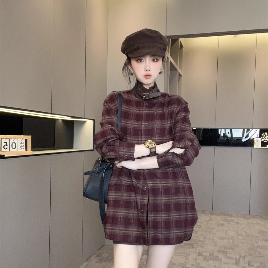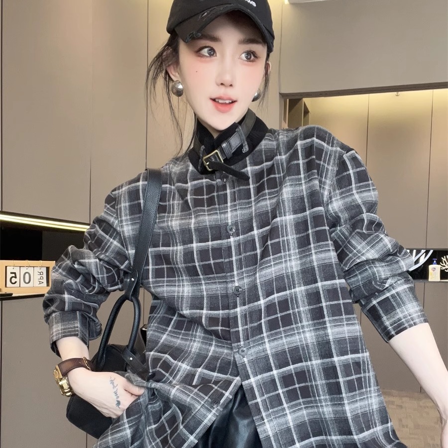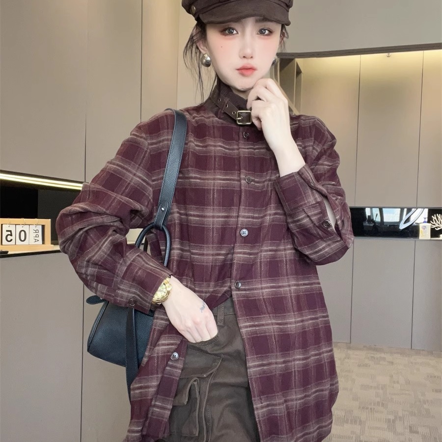 格子长袖衬衫女2025新款秋调节扣立领单排扣衬衣高端欧货洋气上衣