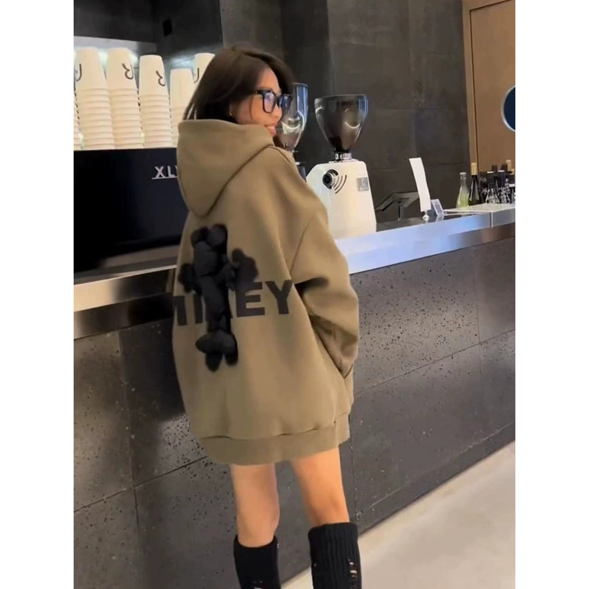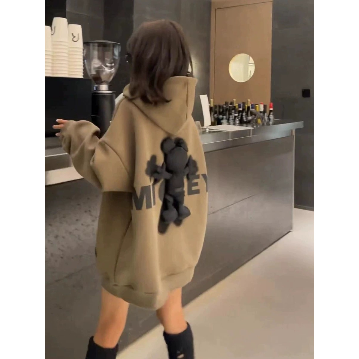 今年流行欧货黑色中长款美式慵懒连帽卫衣外套女春秋慵懒风小个子