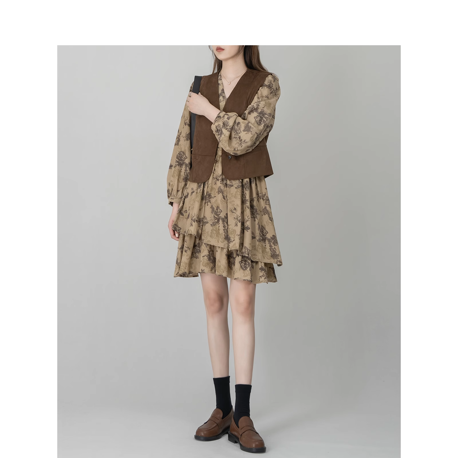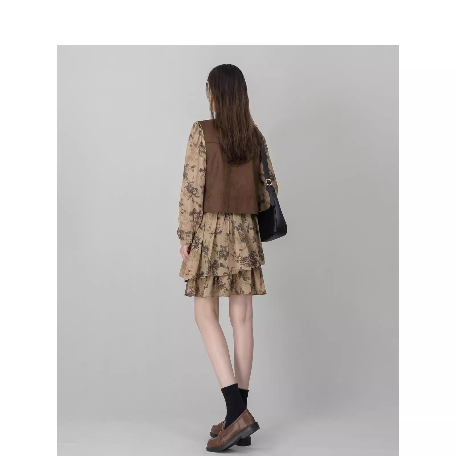 爵莱菲大码胖mm碎花连衣裙套装春秋女气质短款裙子复古马甲两件套