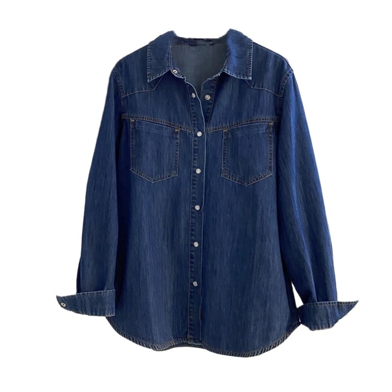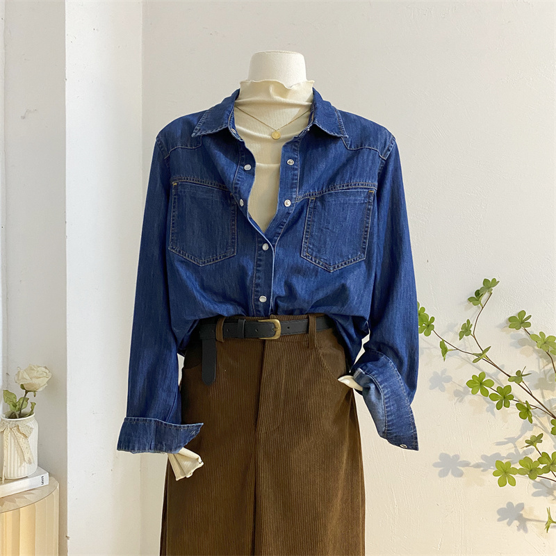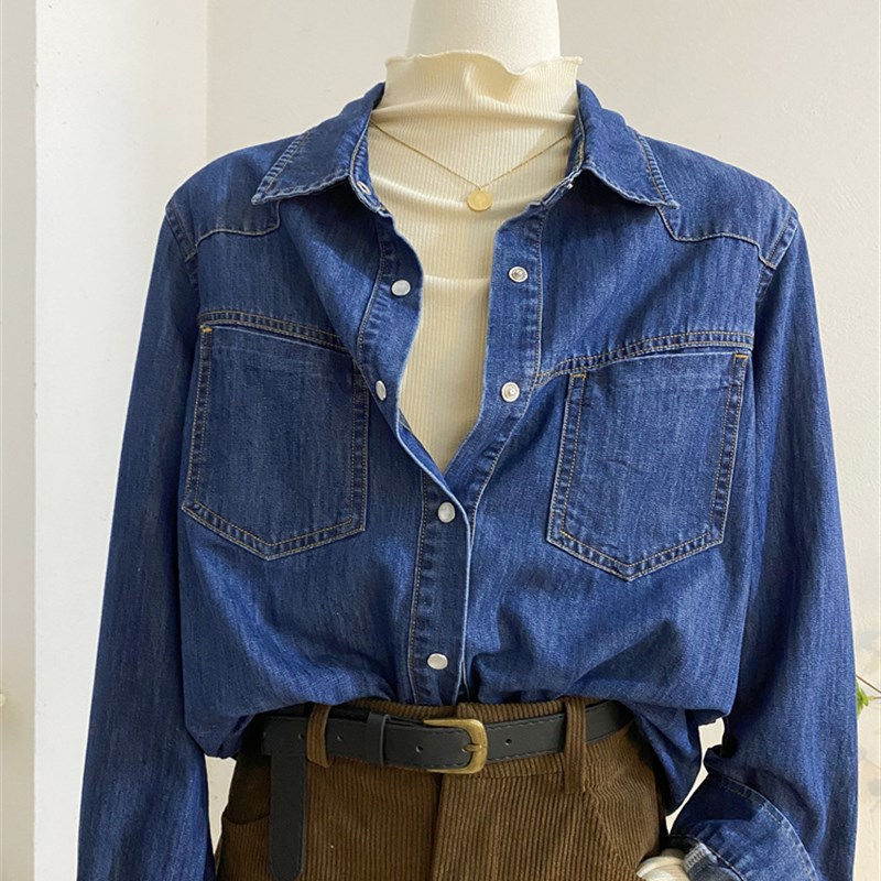 复古水洗深蓝色牛仔衬衫女秋冬宽松百搭叠穿长袖衬衣外套港风上衣