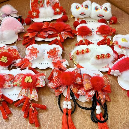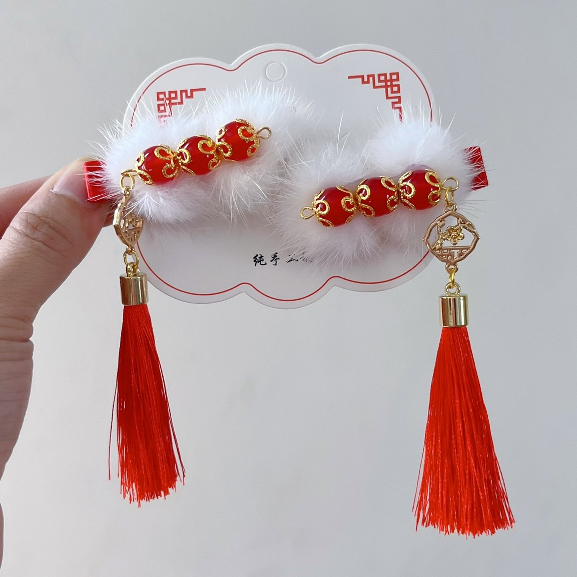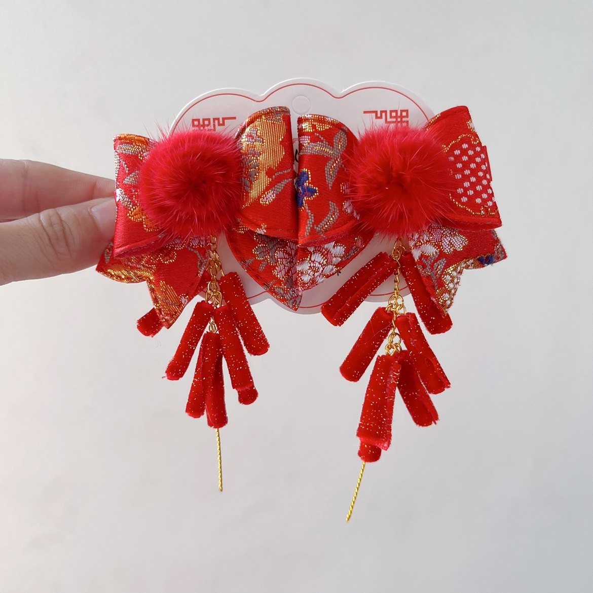新年女童头饰春节拜年喜庆红色毛绒流苏发夹发卡可爱鞭炮发饰