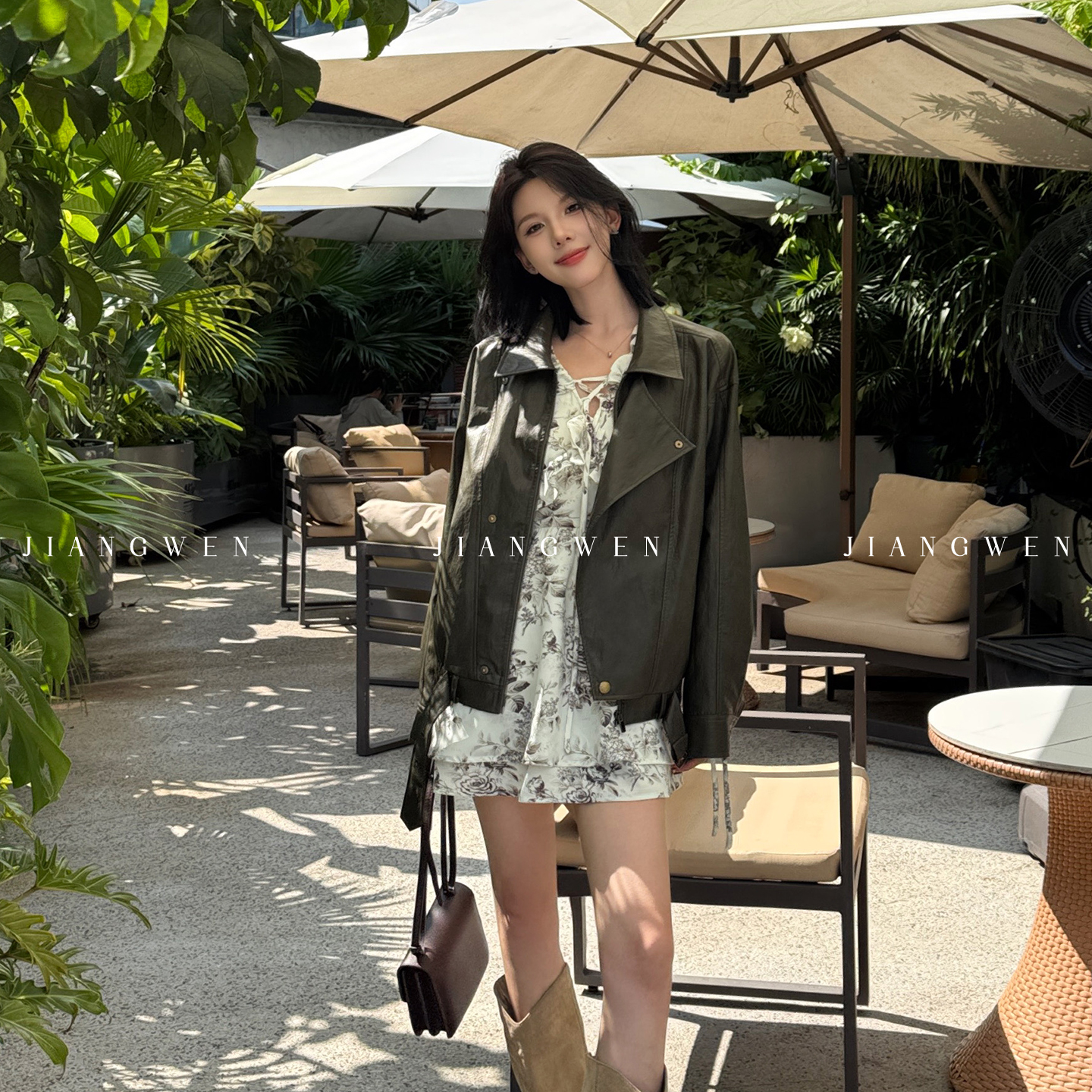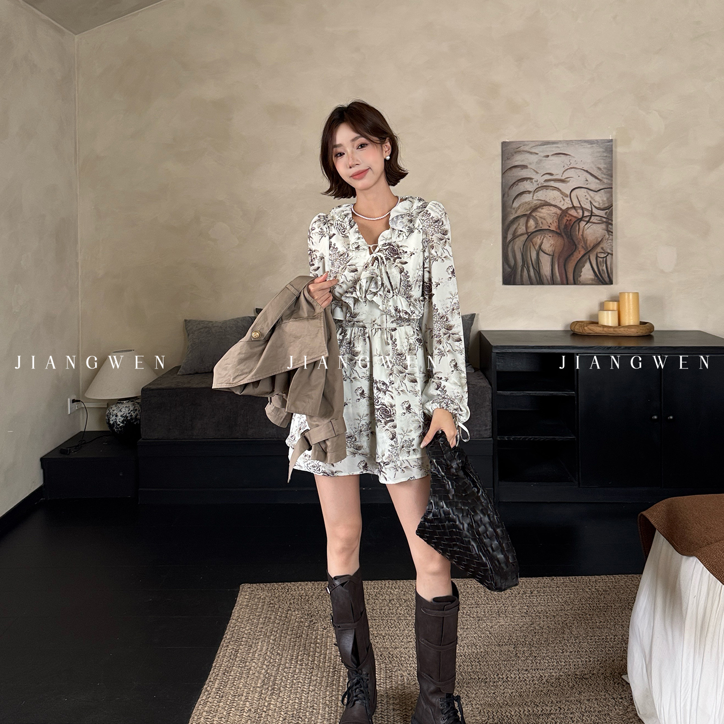 姜雯 复古浪漫V领荷叶边短款层次连衣裙女秋季法式印花长袖仙女裙
