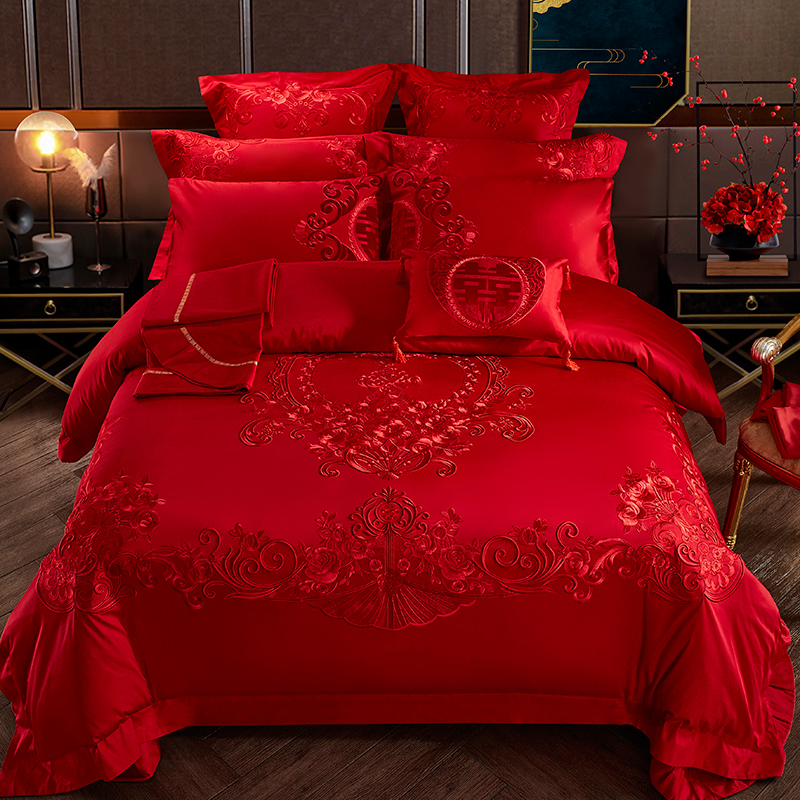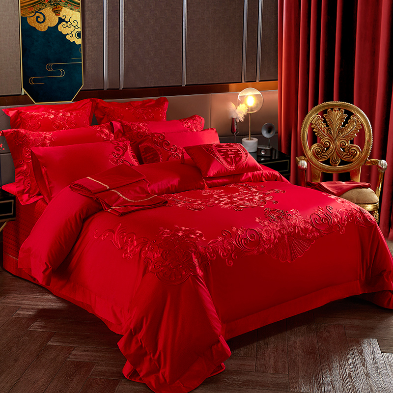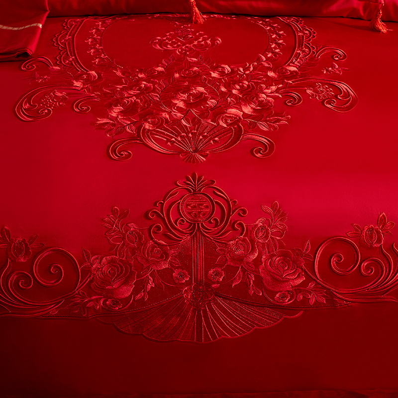 100s支全棉婚庆四件套刺绣婚房床上用品大红色喜被子结婚六十件套