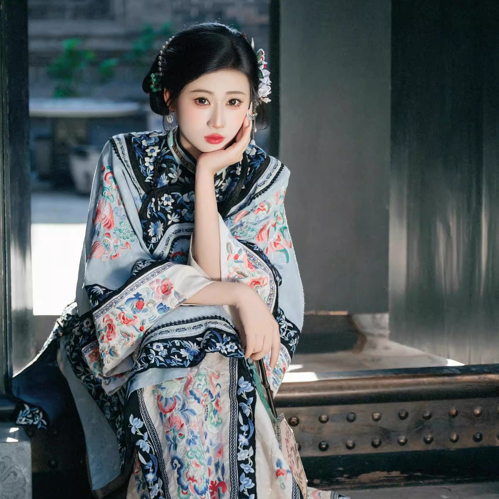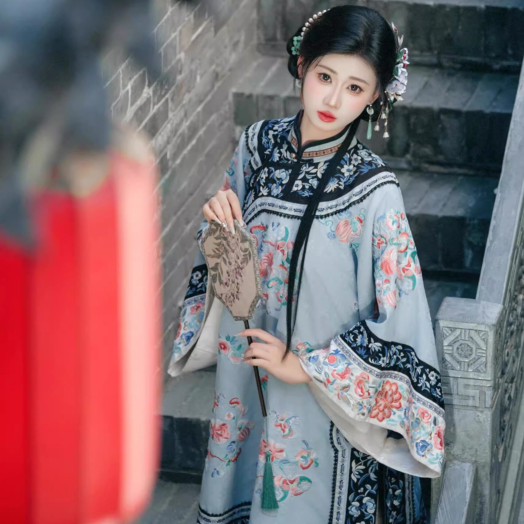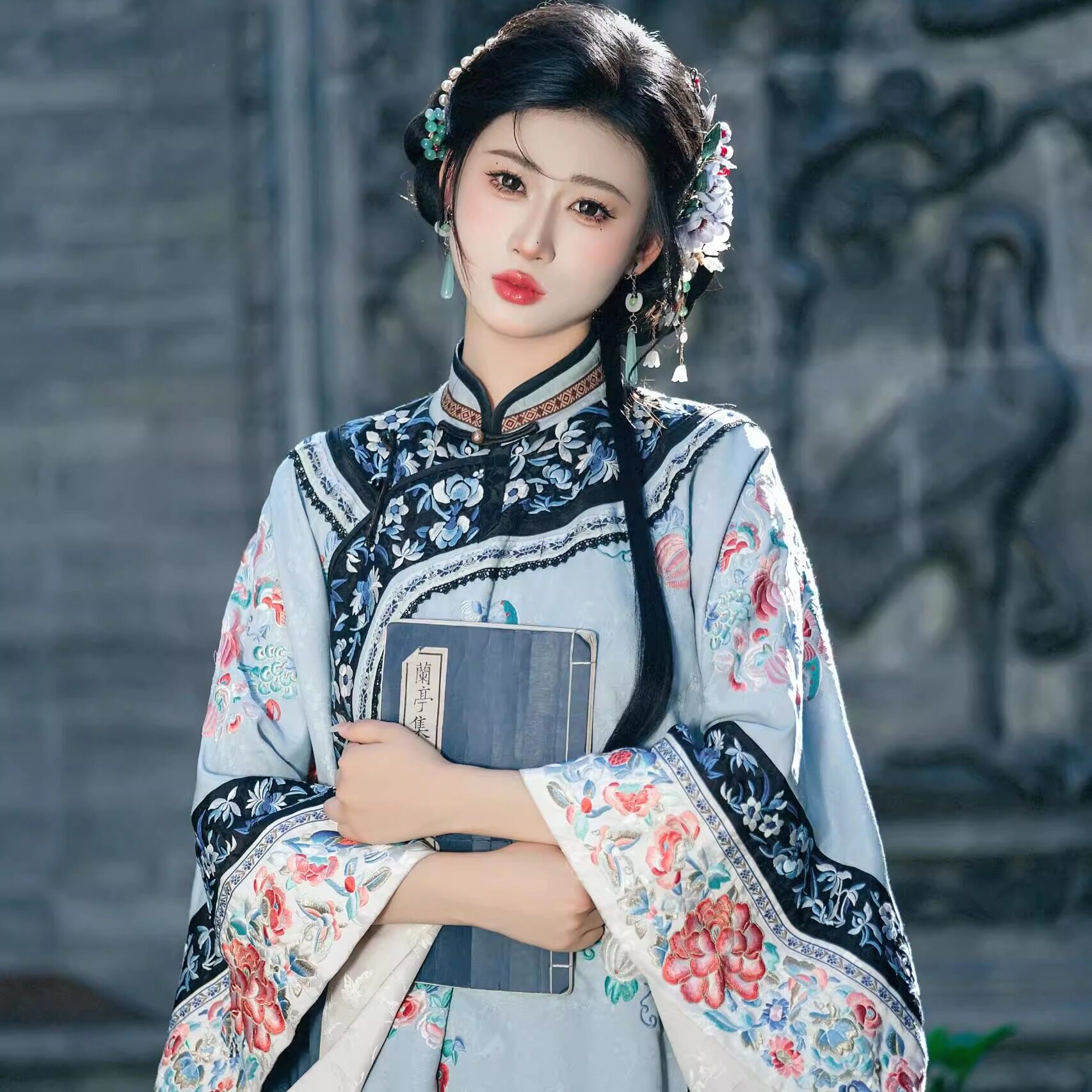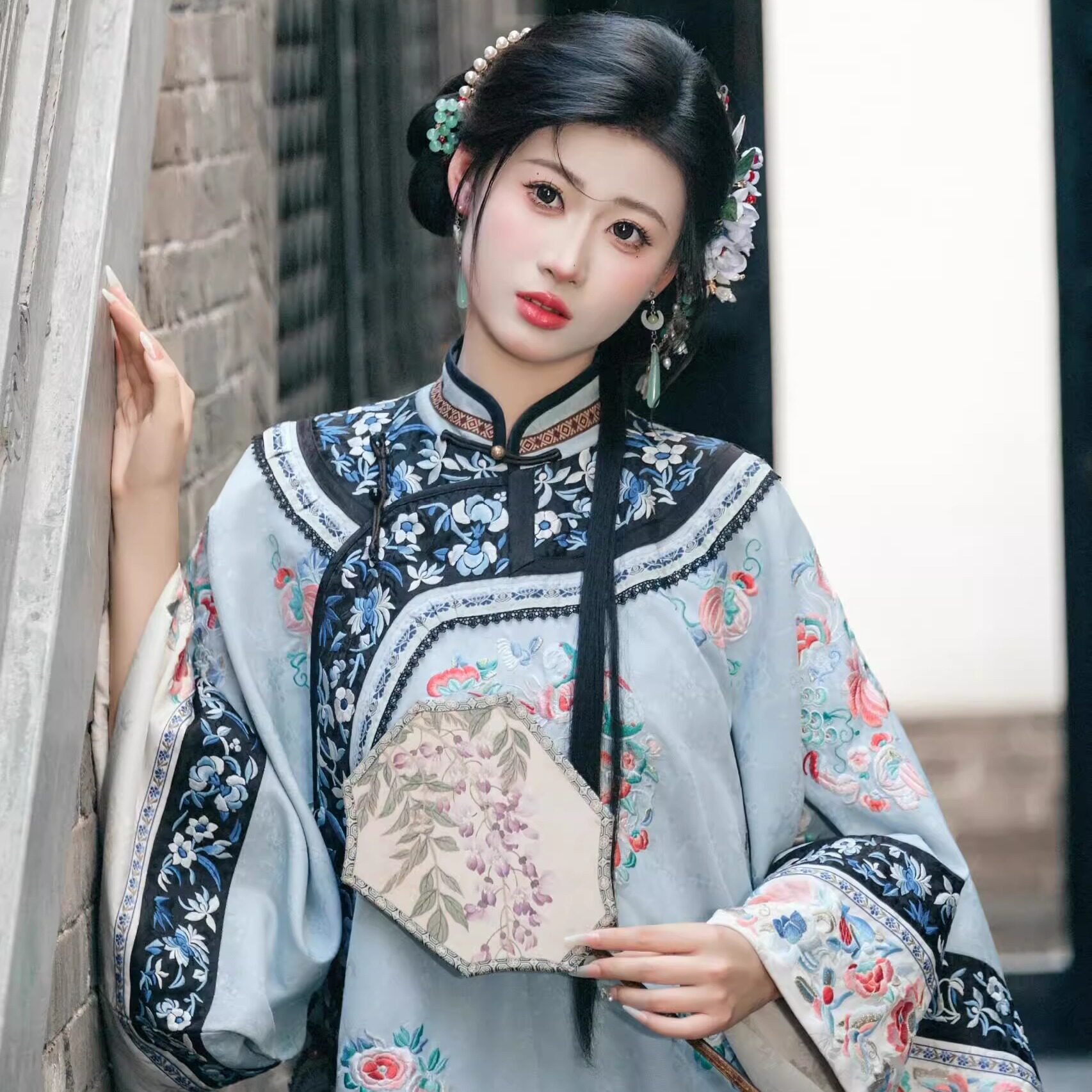 清汉女婉晴浅蓝满绣上衣晋商少奶奶鳖衣重工立领斜襟格格服大小姐