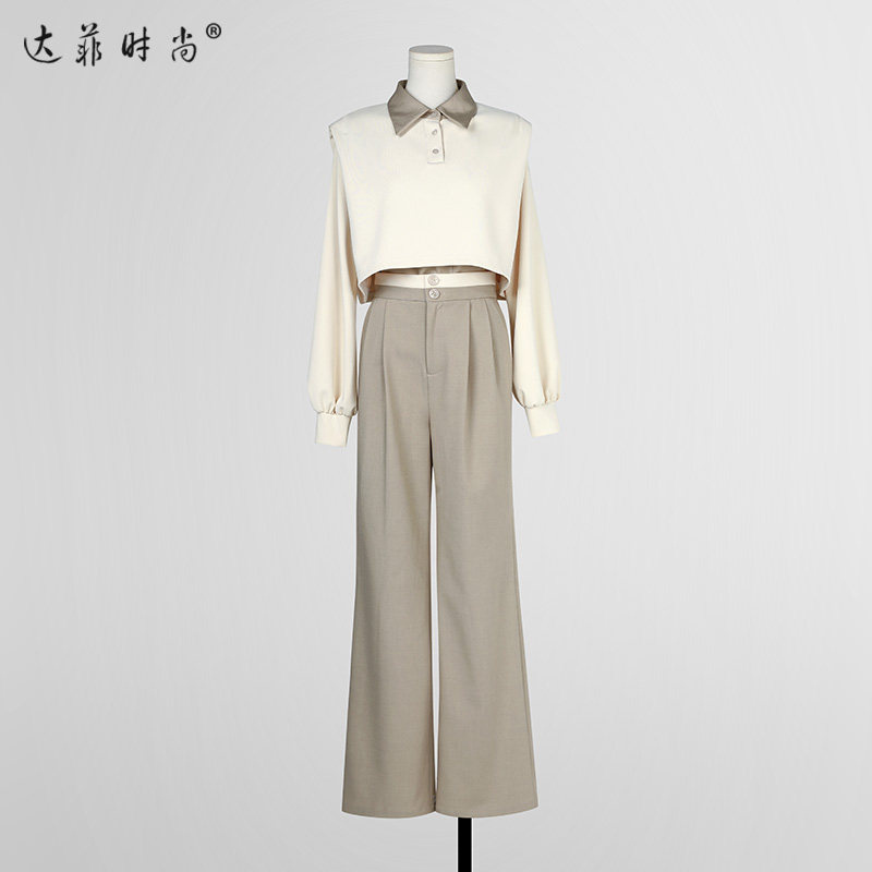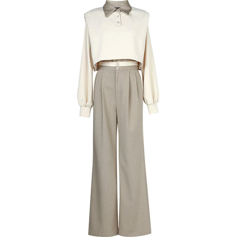 2025秋季新款休闲撞色假两件宽松长袖卫衣+高腰窄版阔腿长裤套装