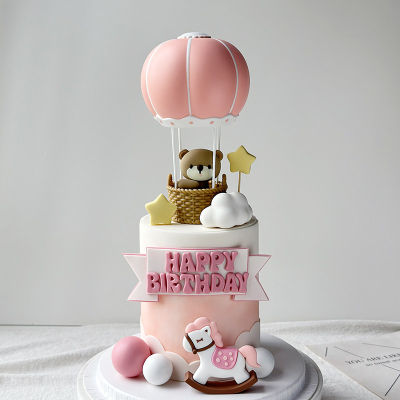 网红热气球蛋糕装饰粉蓝卡通小熊木马玩偶摆件儿童生日周岁插牌