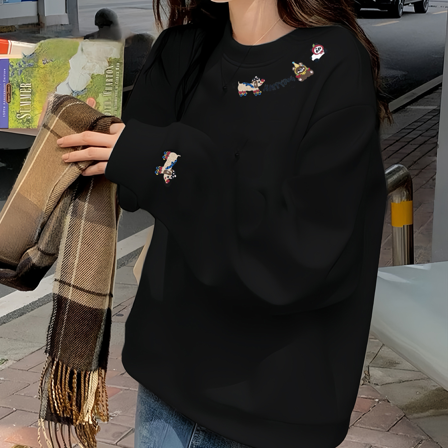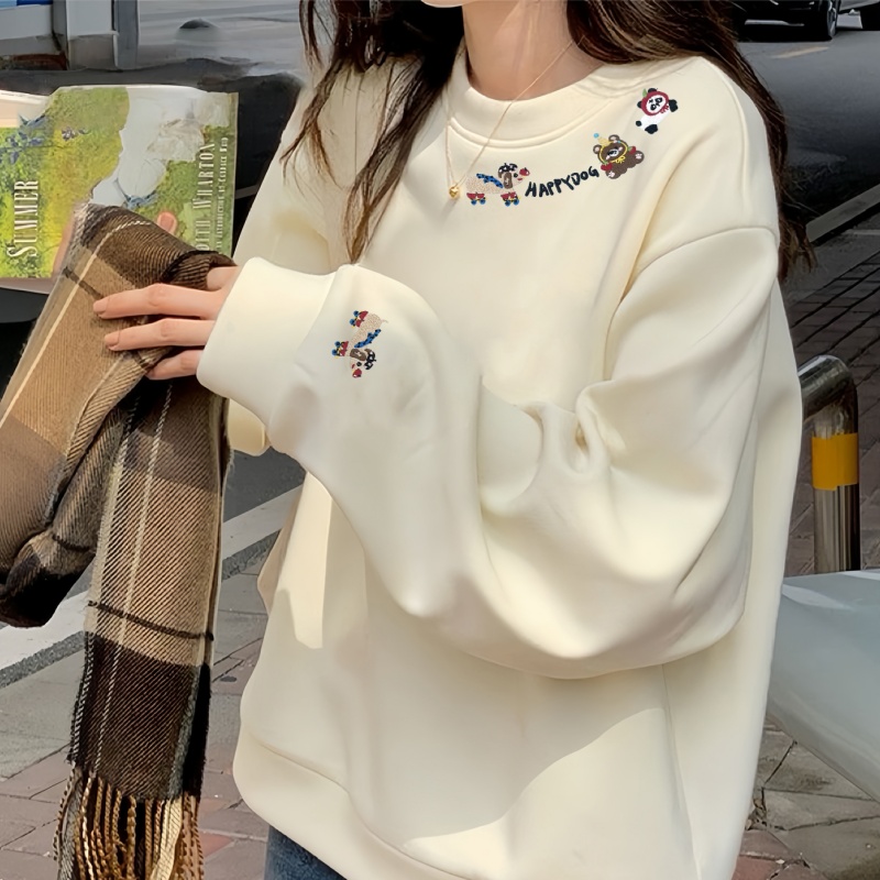 2025秋冬季新款加绒加厚杏色卫衣女宽松百搭爆款卡通印花上衣外套