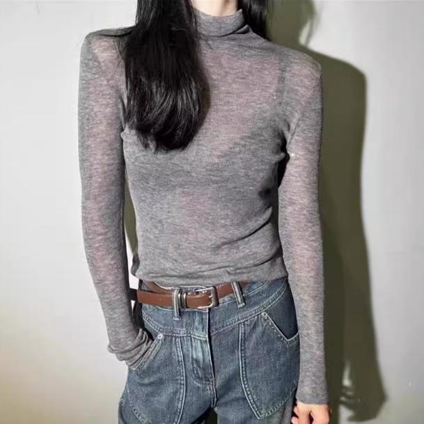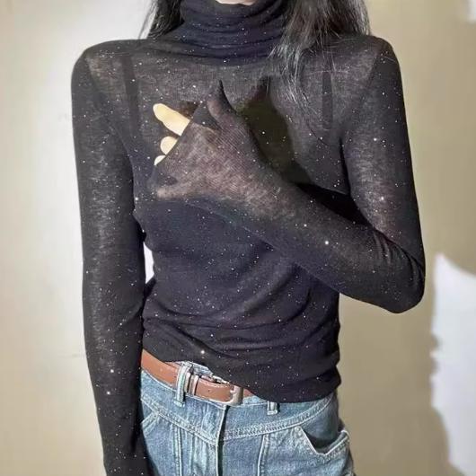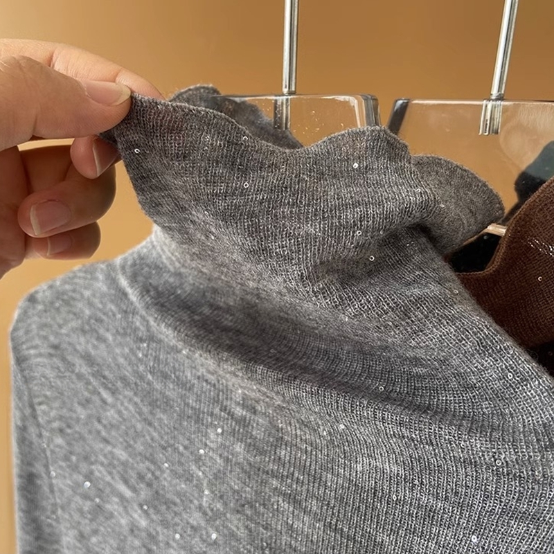 咖色秋冬羊绒打底衫亮片微透堆堆高领针织打底衫亮丝毛衣薄款内搭