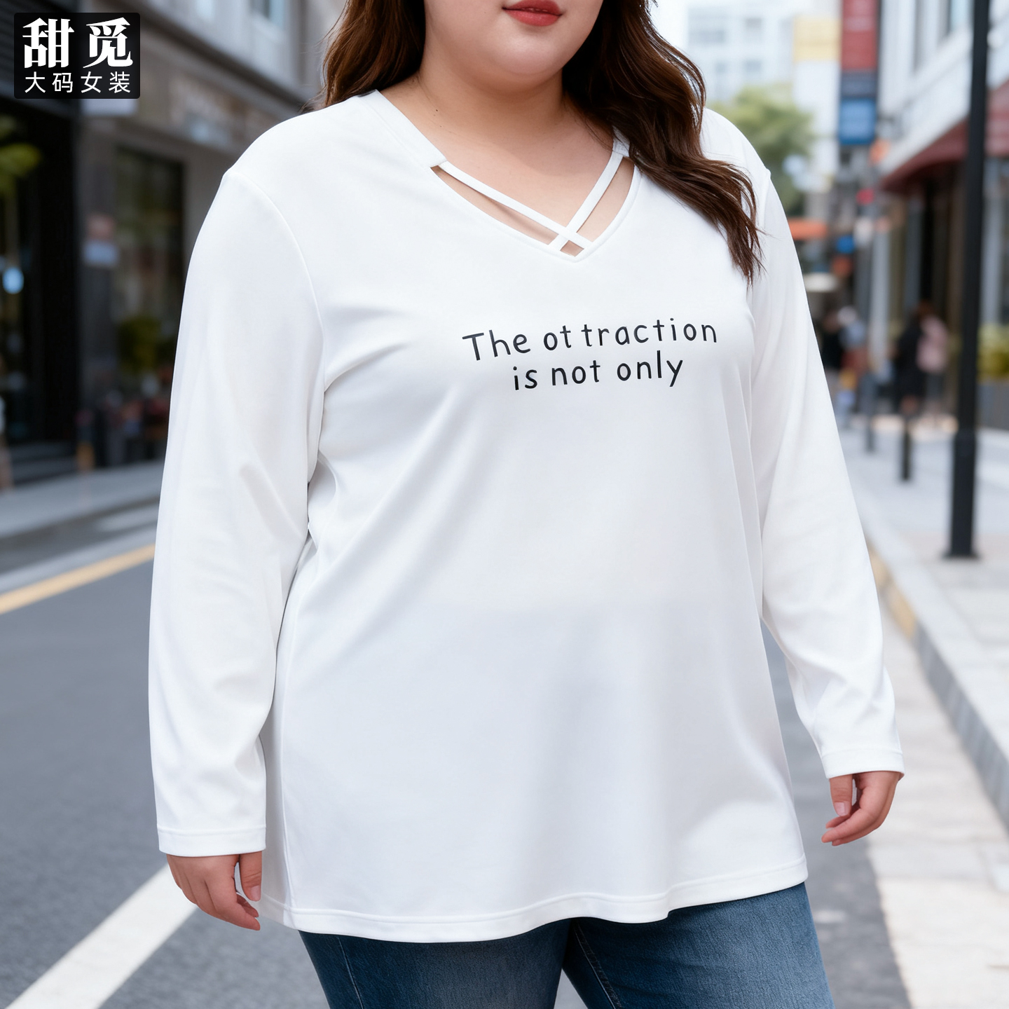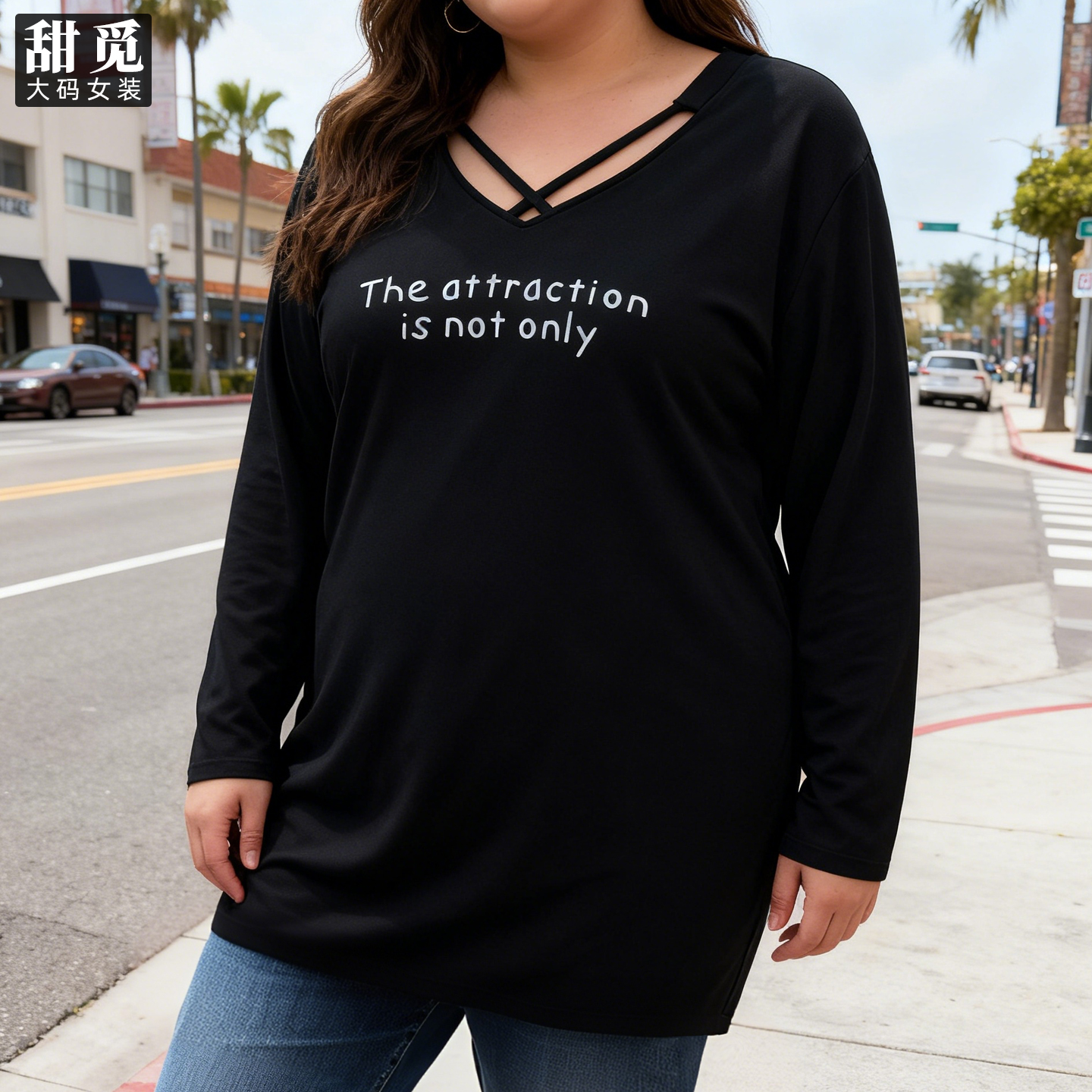 甜觅特大码女装2025秋装胖mm300斤字母印花中长款宽松镂空V领卫衣