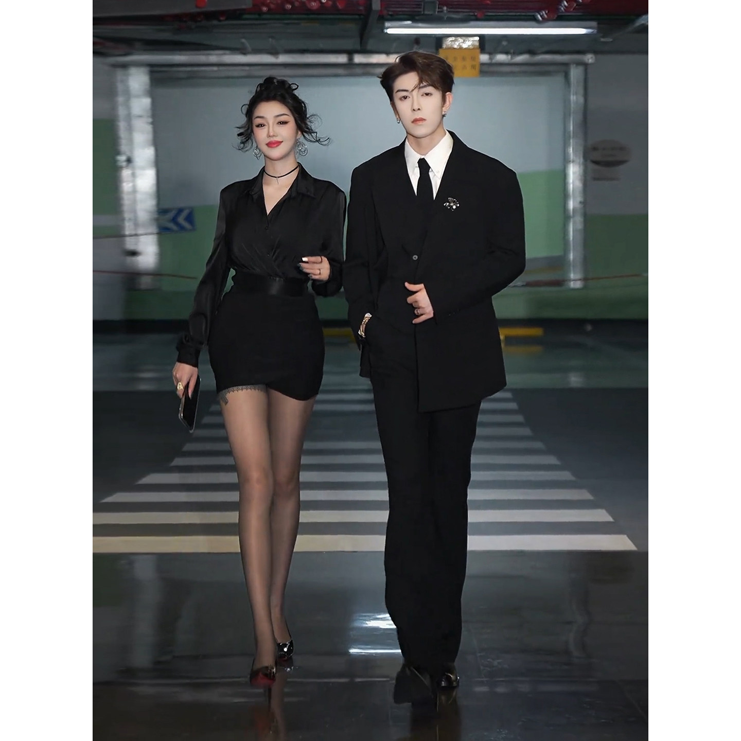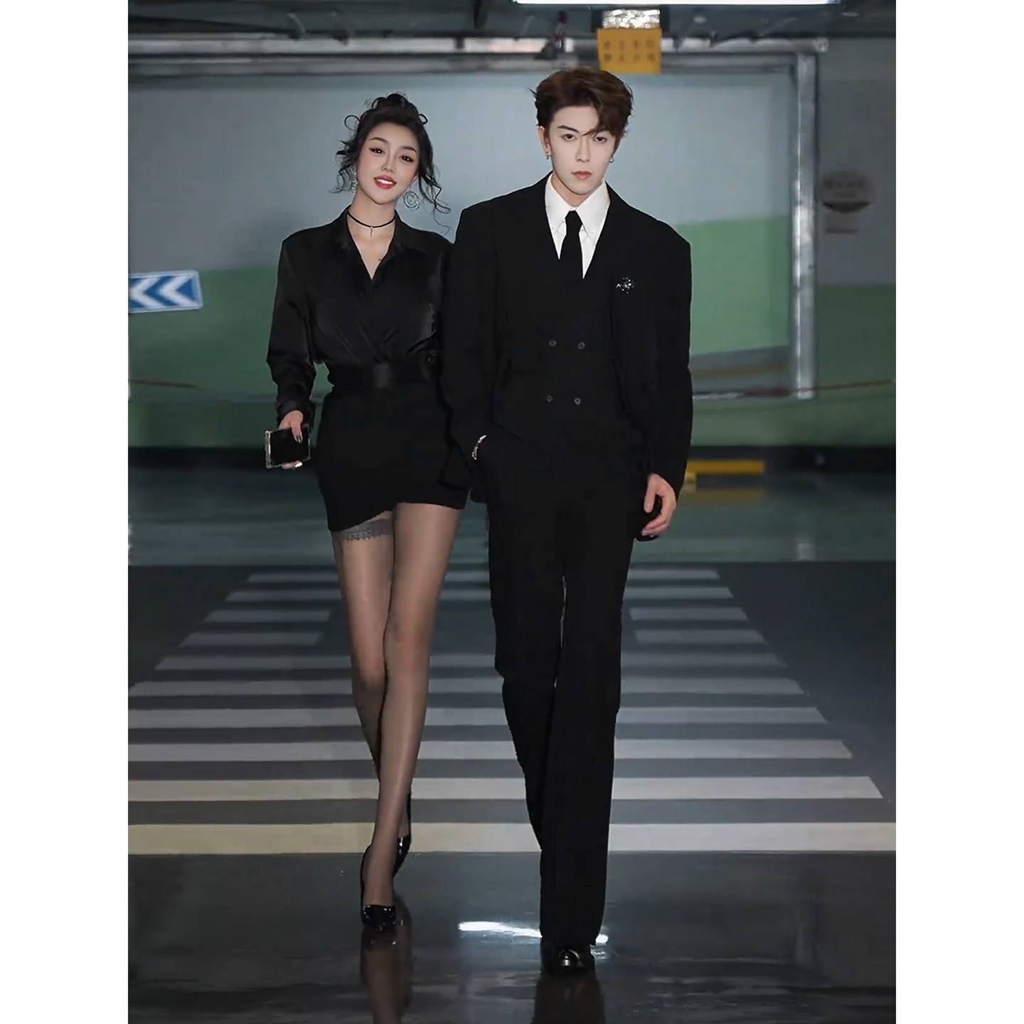 黑色戗驳领西装套装男韩版修身新郎礼服商务休闲正装痞帅西服西裤