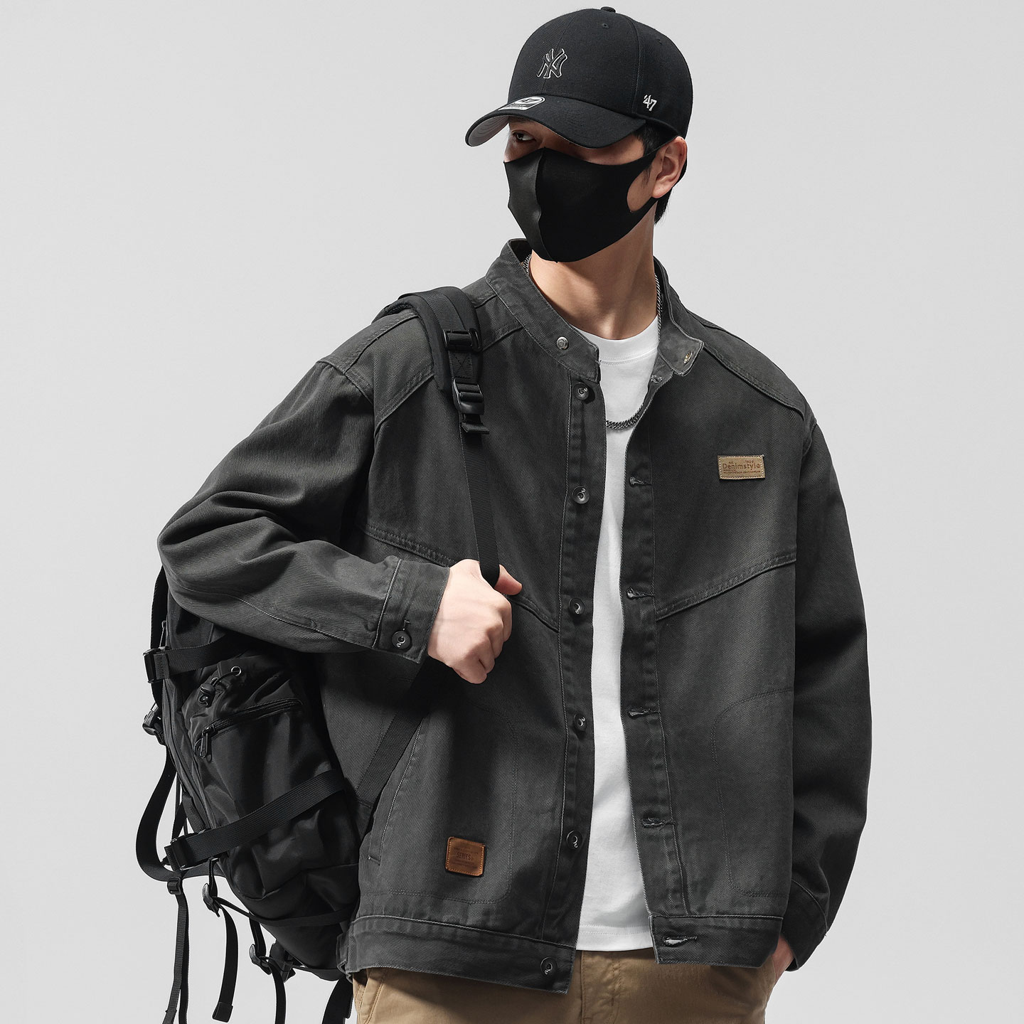 2025秋季新款复古咖啡色牛仔外套男士春秋美式圆领宽松夹克男潮流