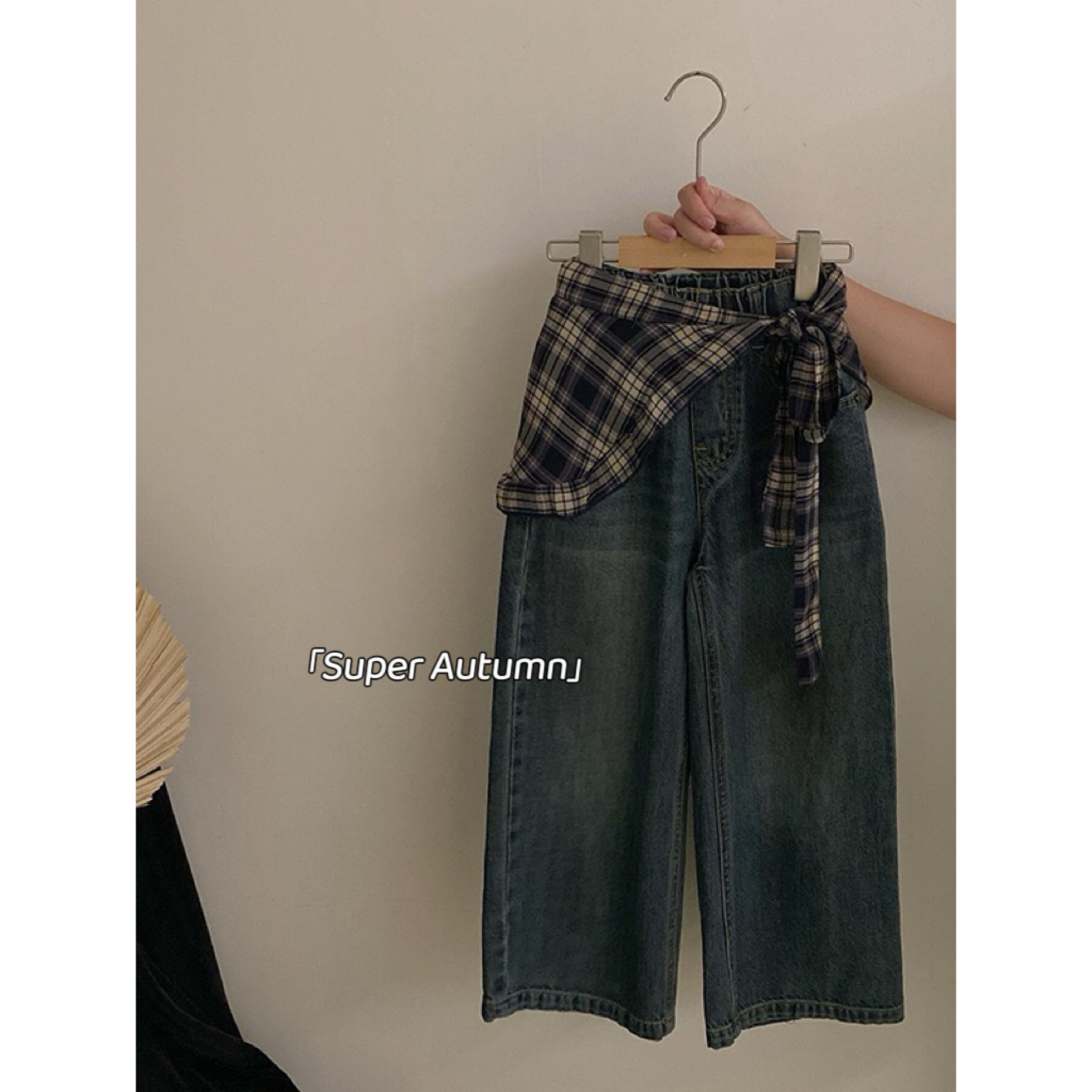 女童秋季新款韩版高定小花吊带上衣长袖两件套格子屁帘做旧牛仔裤