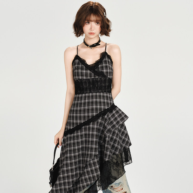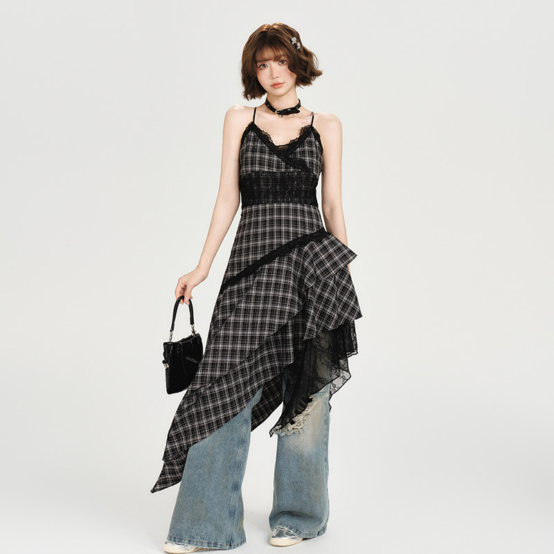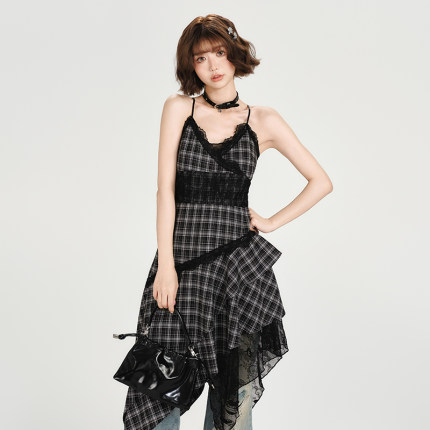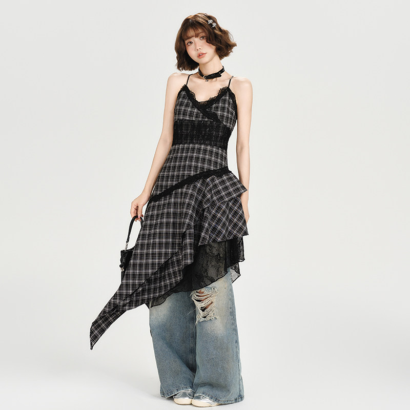Girlyhalo美式复古格子吊带连衣裙女夏新款蕾丝不规则下摆中长裙