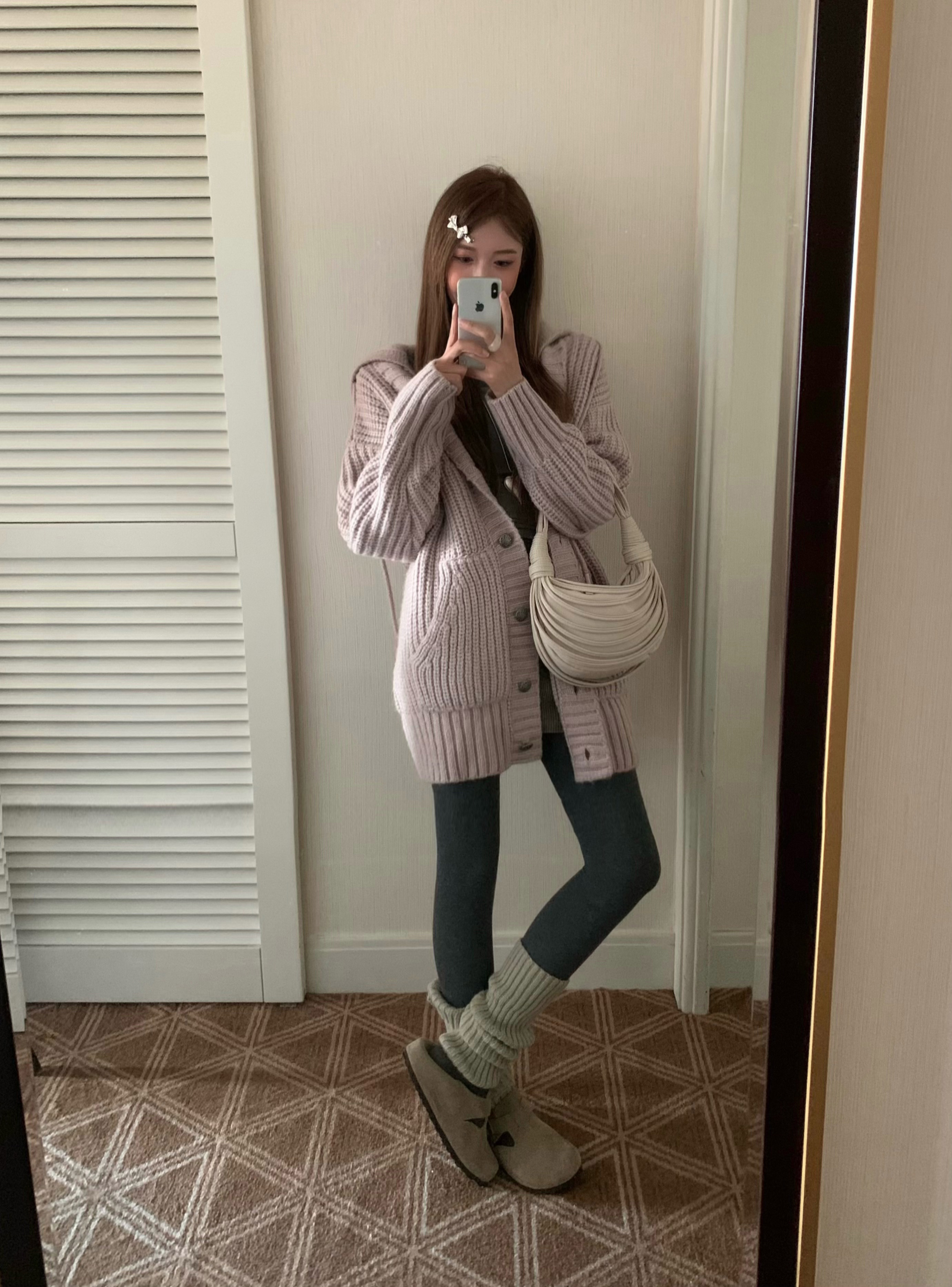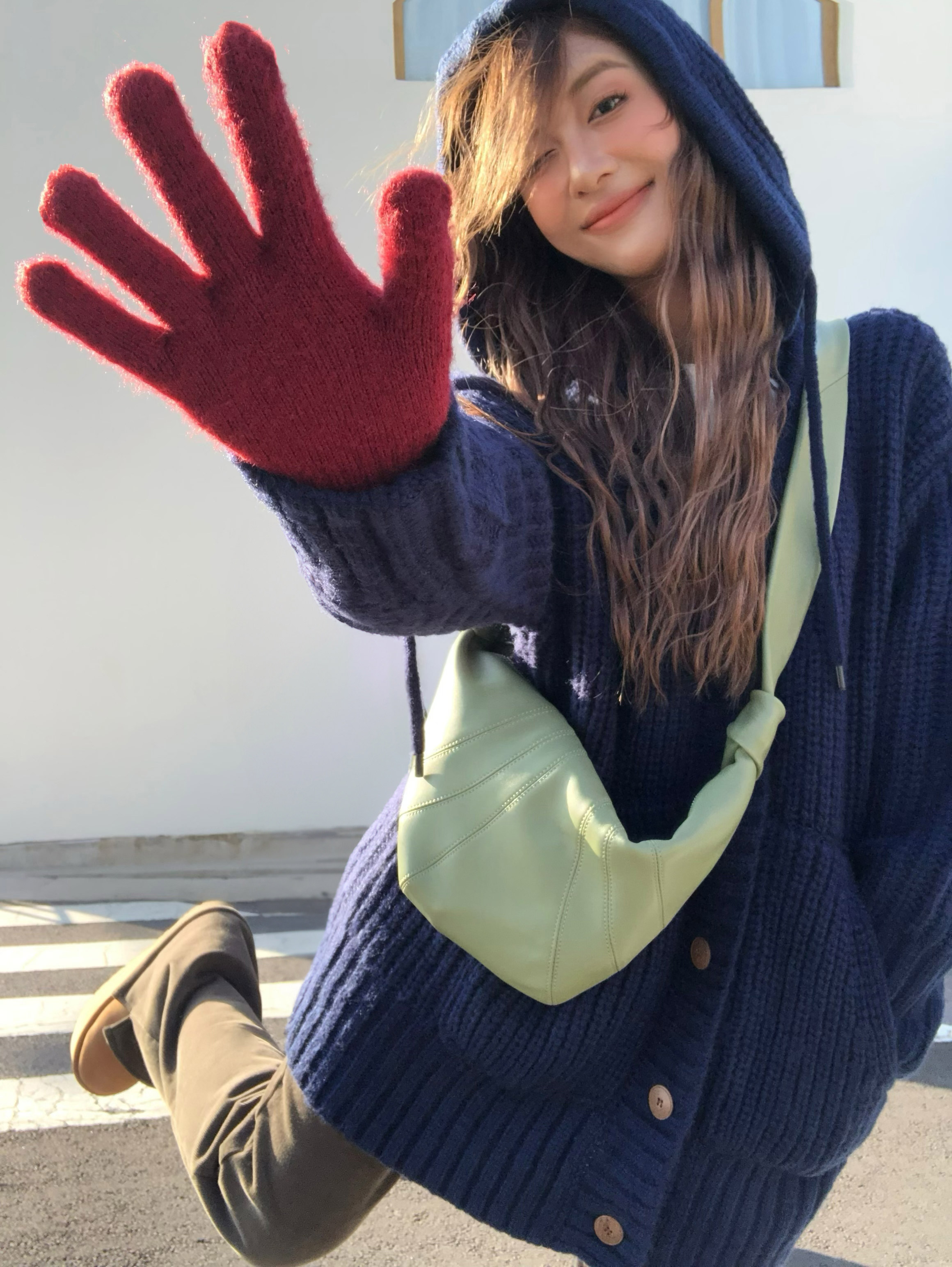soolrok 松未韵一 韩系两色大连帽粗针厚毛衣开衫女宽松外套上衣