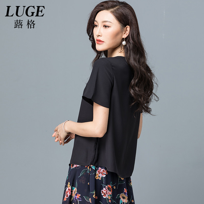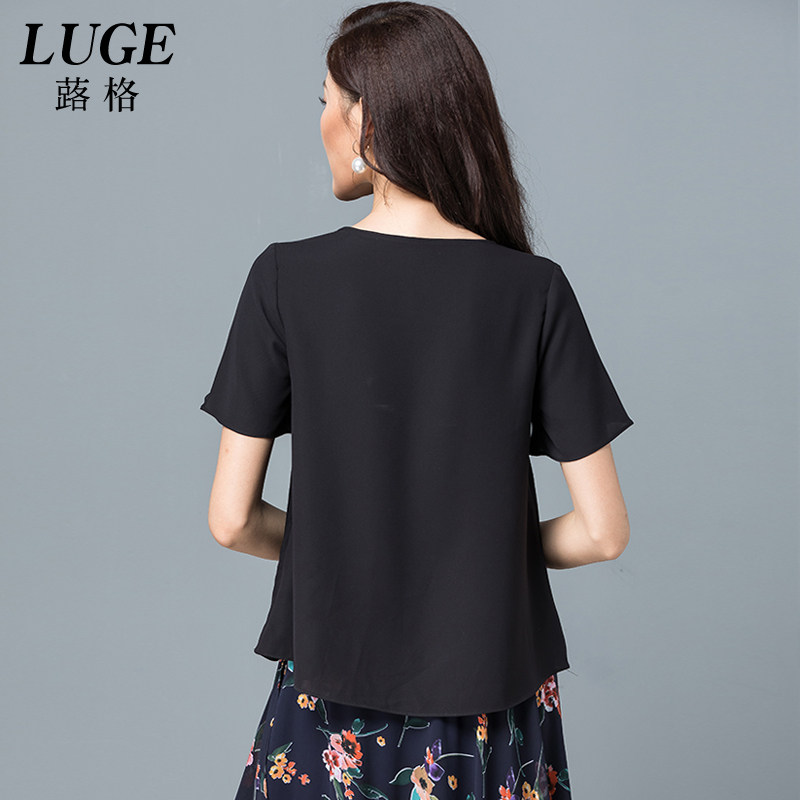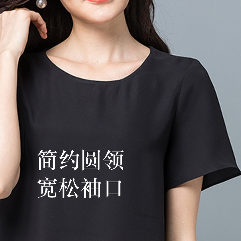 新款配阔腿裤的上衣女夏时尚洋气短袖雪纺衫搭配裙子黑色宽松小衫