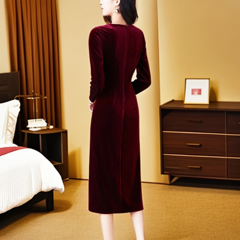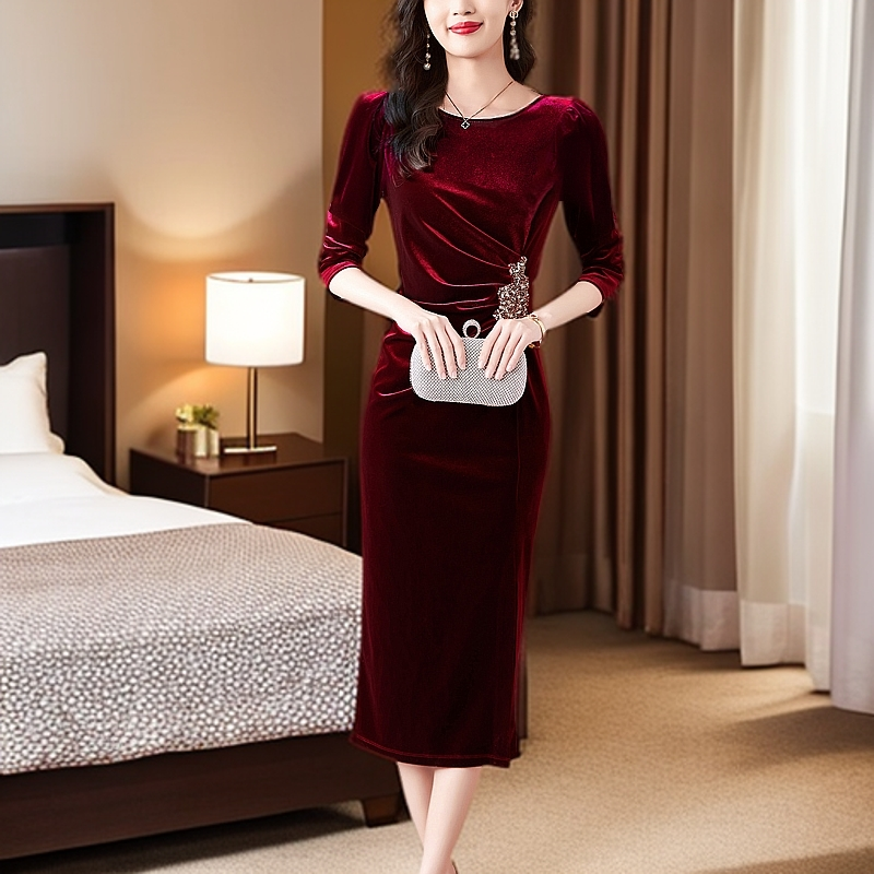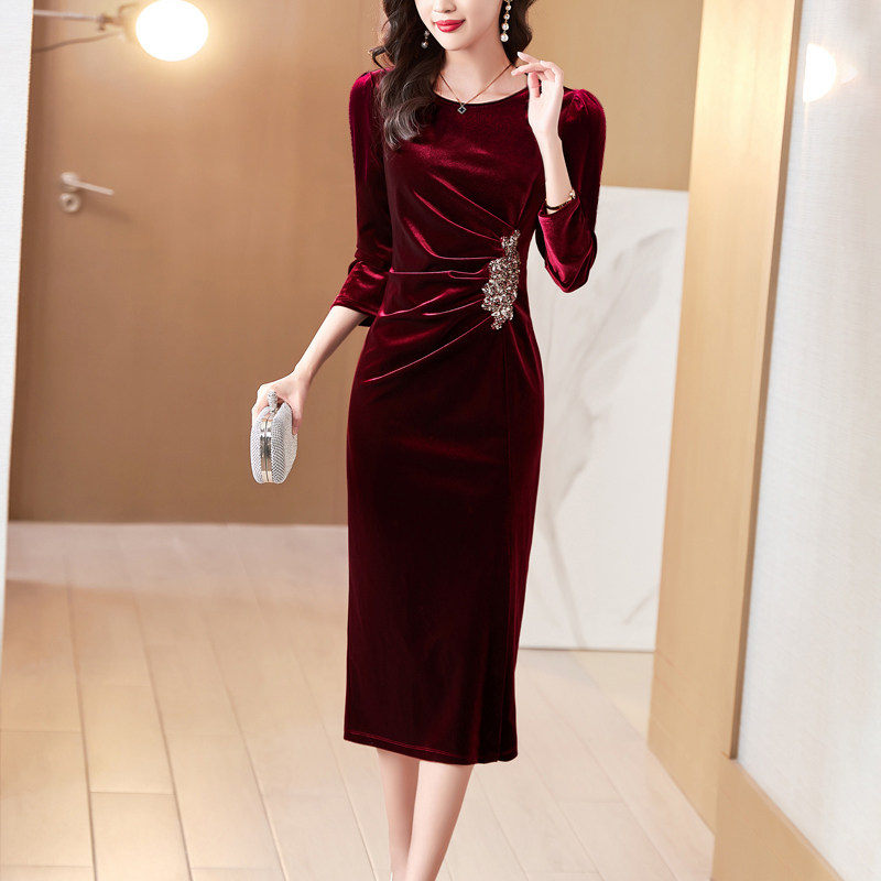 酒红色金丝绒连衣裙女2024秋冬新款中长款包臀裙喜庆妈妈装礼服
