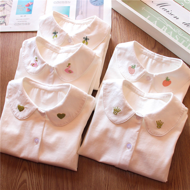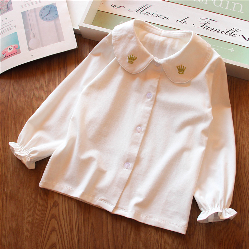 儿童纯棉打底衫日系娃娃领刺绣白色衬衫女童宝宝春秋百搭开衫上衣