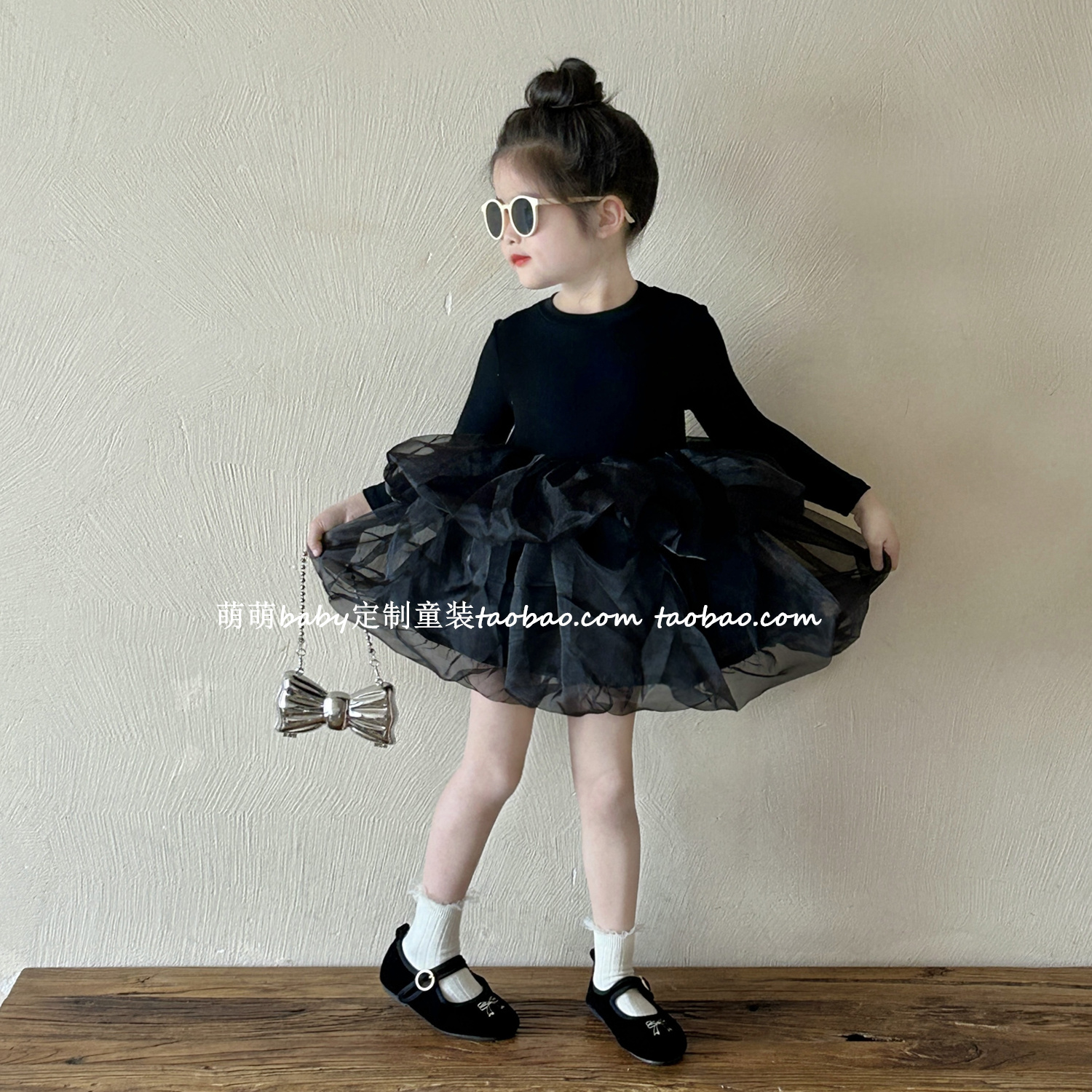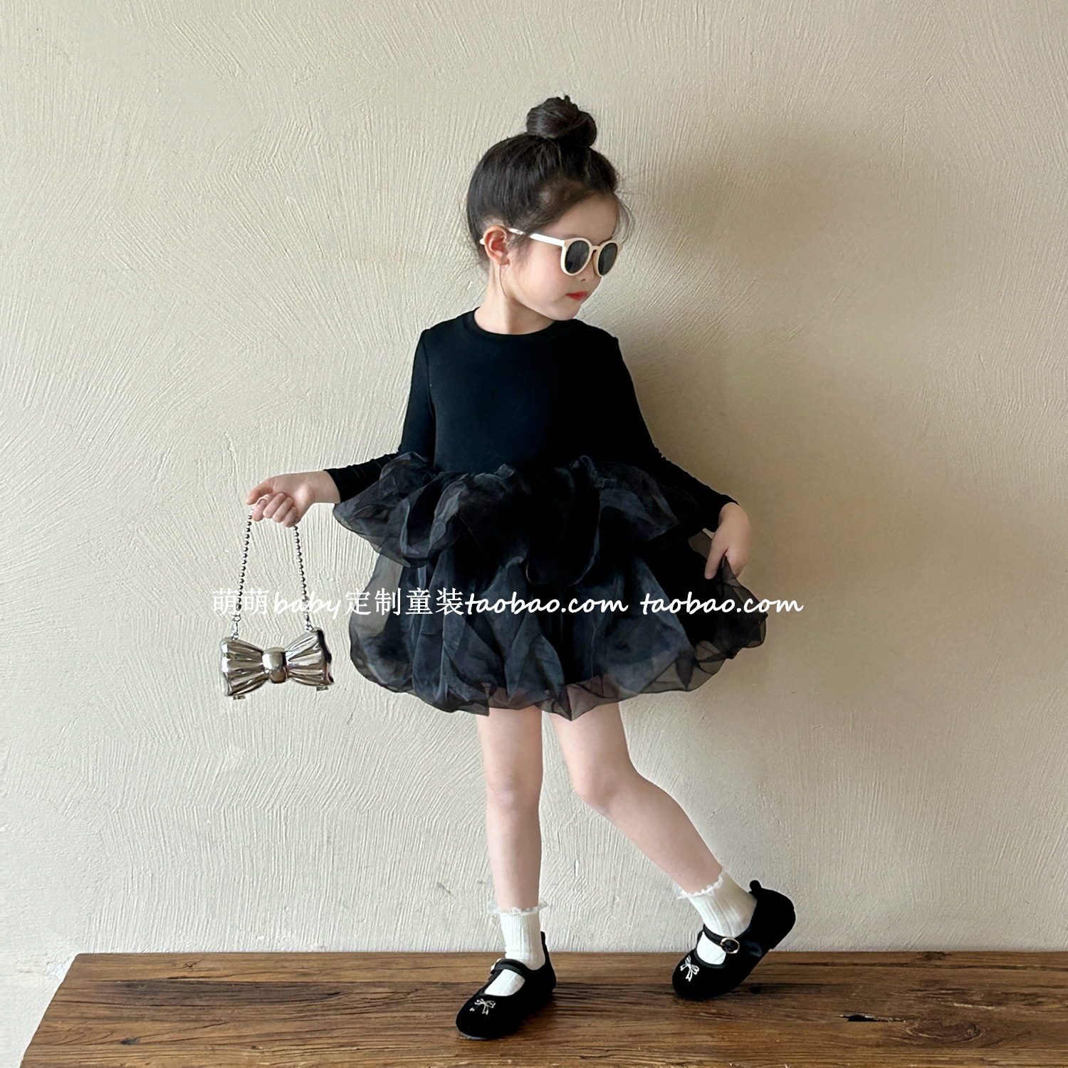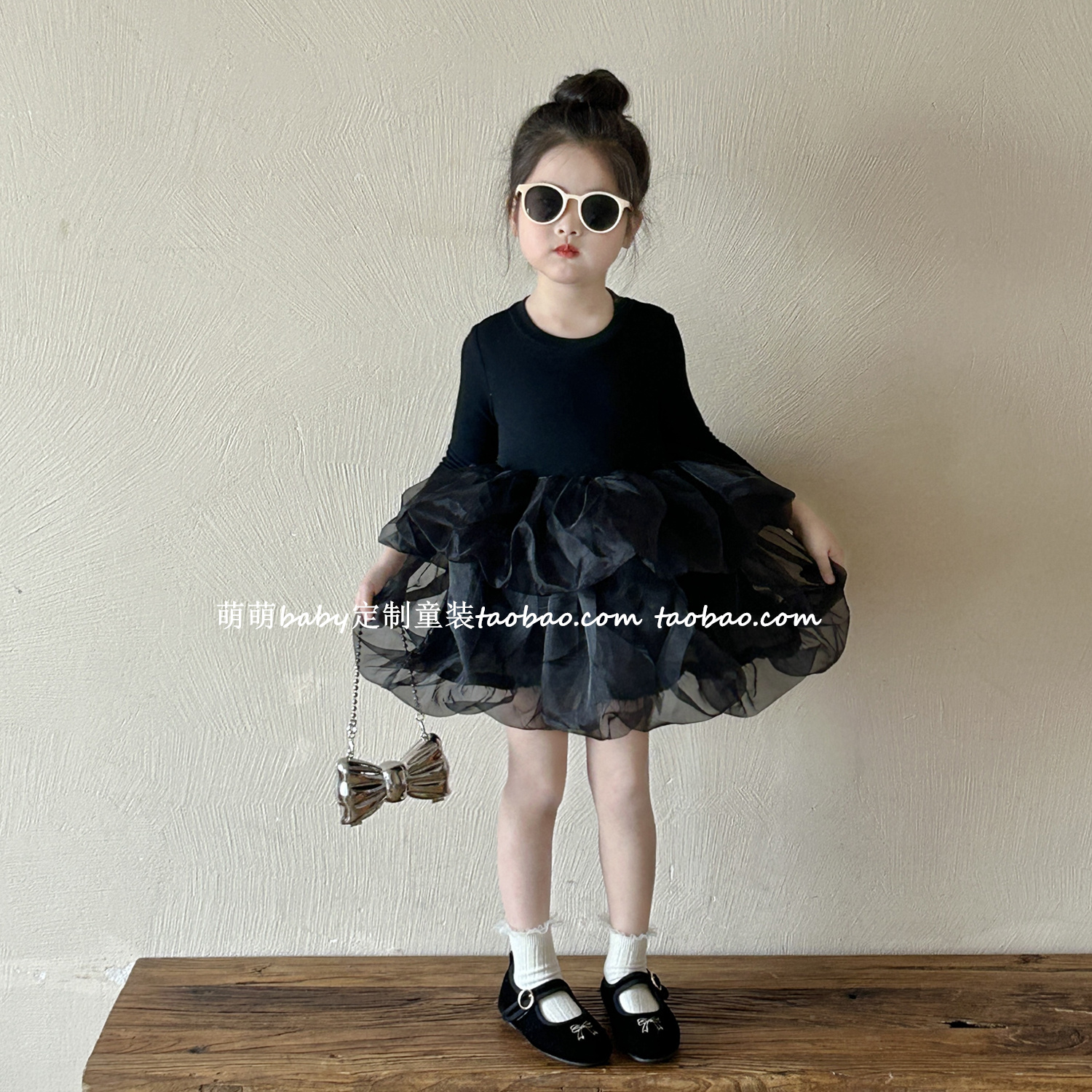 女童长袖蓬蓬公主裙小黑裙2025秋季小女孩芭蕾舞裙气质网纱连衣裙