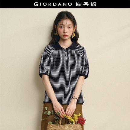 设计师款佐丹奴2026年夏条纹宽松娃娃领插肩短袖polo衫女18316202