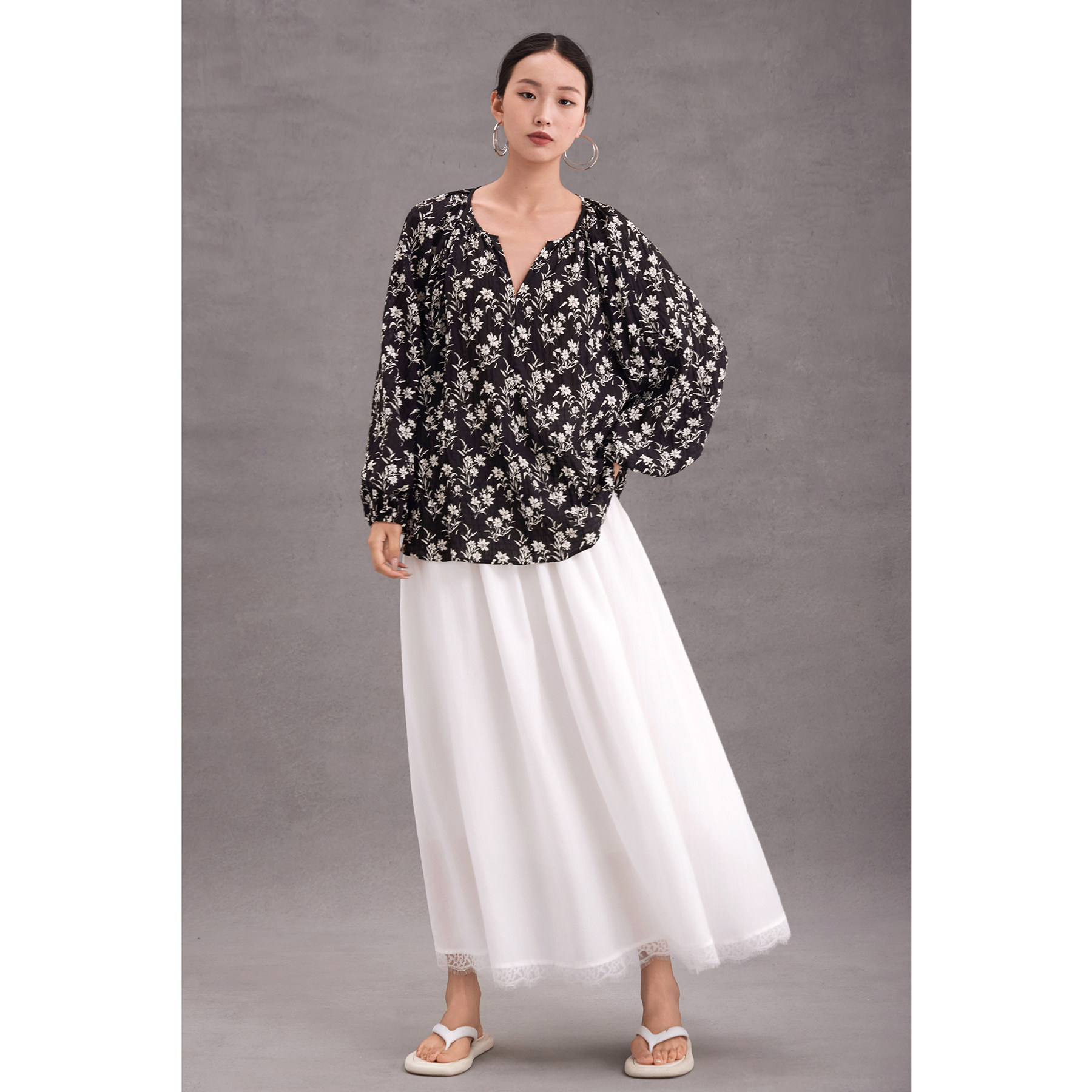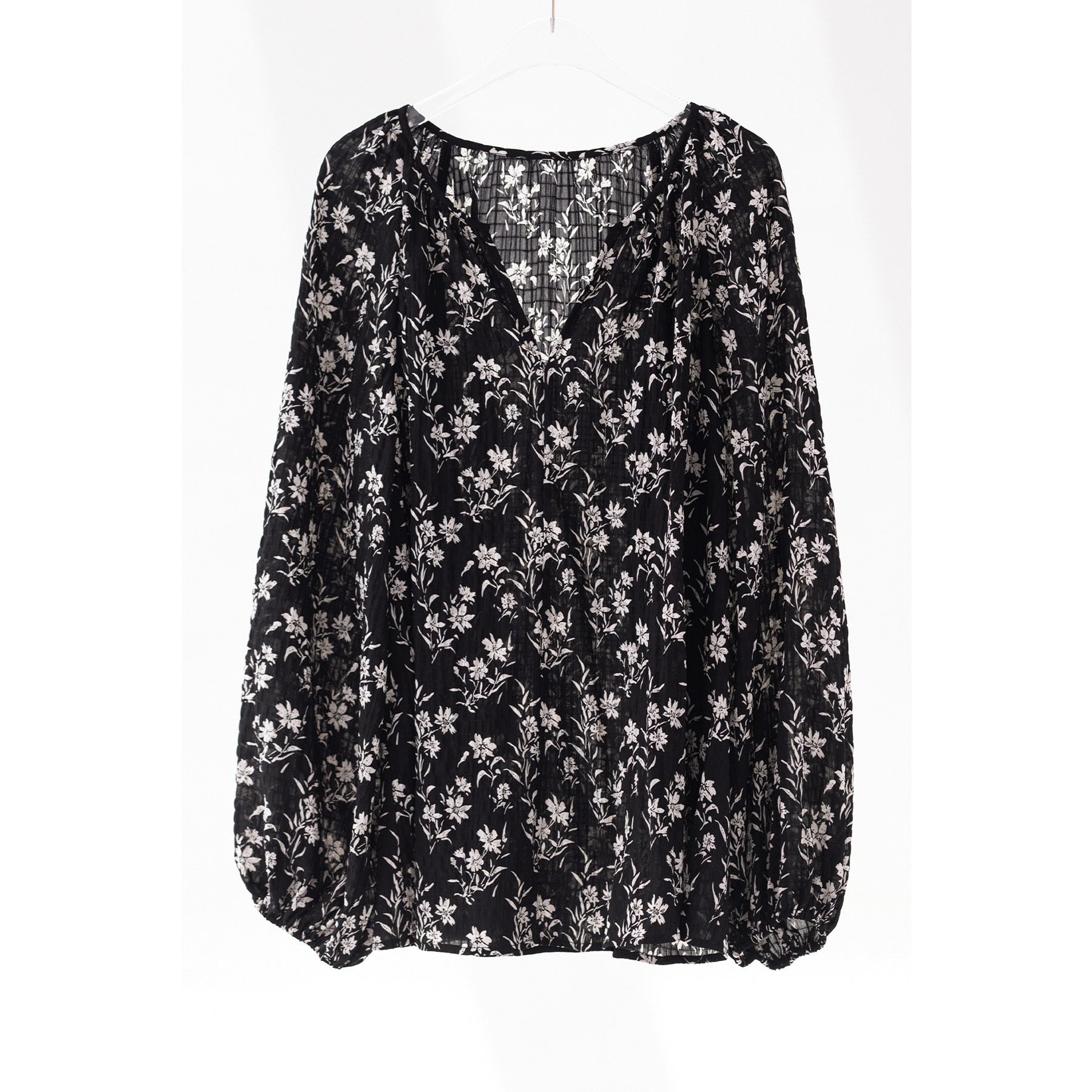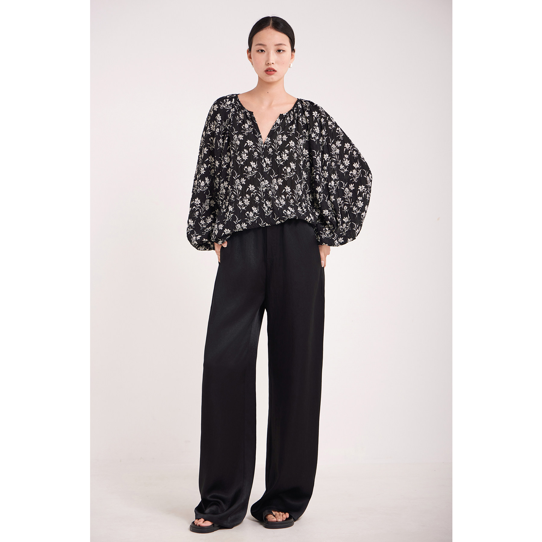 CR宽松V领灯笼袖印花上衣衬衫黑