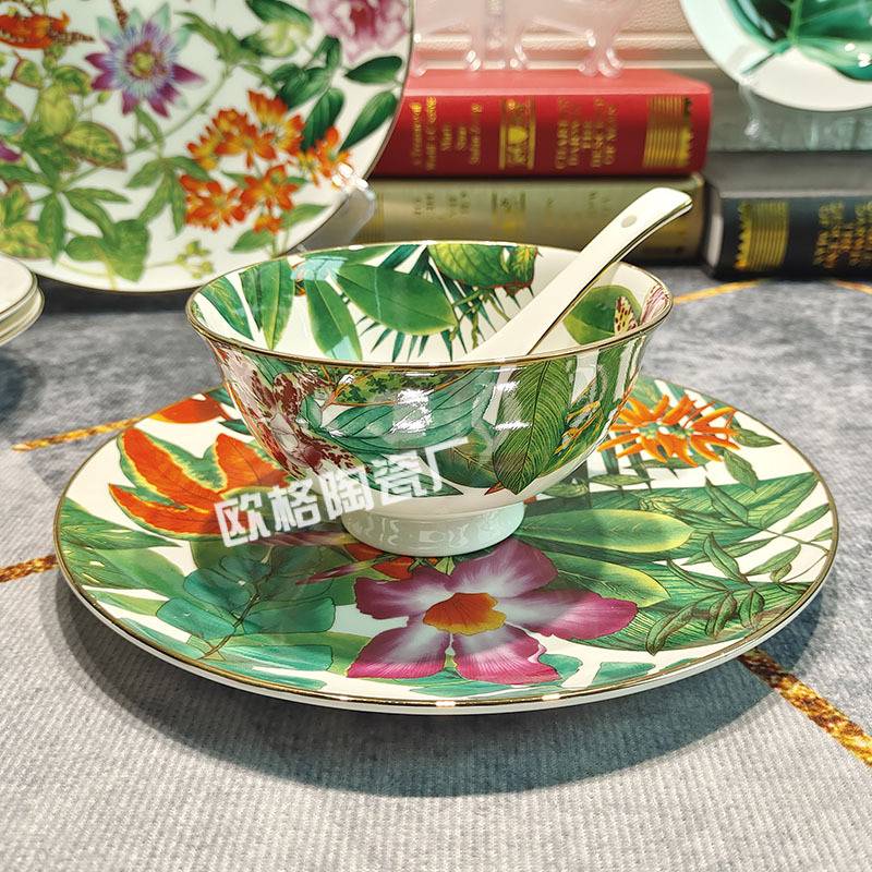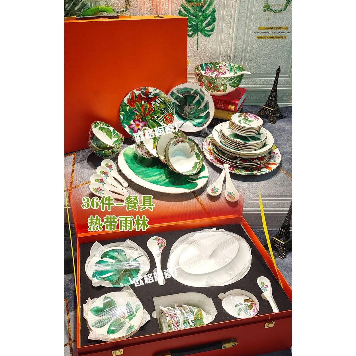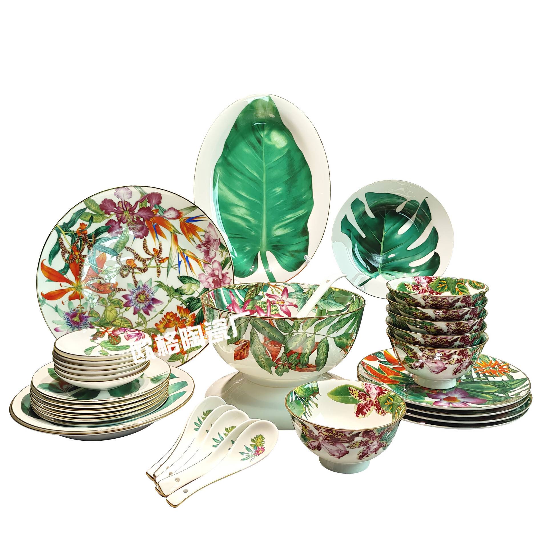 跨境欧式插画风骨瓷36件热带雨林餐具碗碟套装菜盘子碗面碗鱼盘瓷