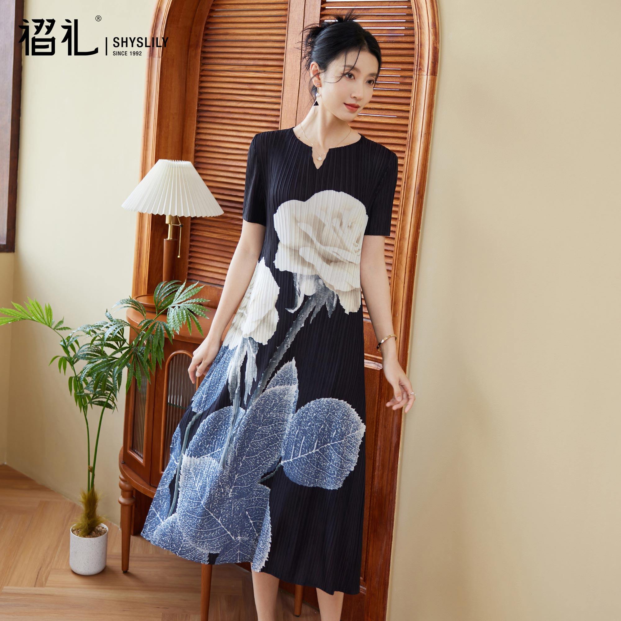 三宅高贵妈妈夏装连衣裙女2026新款宽松褶皱大码气质印花黑色长裙