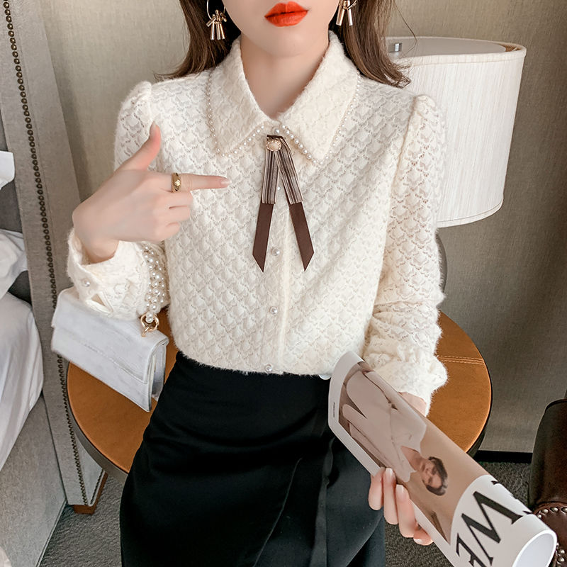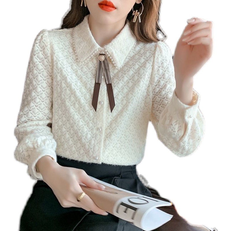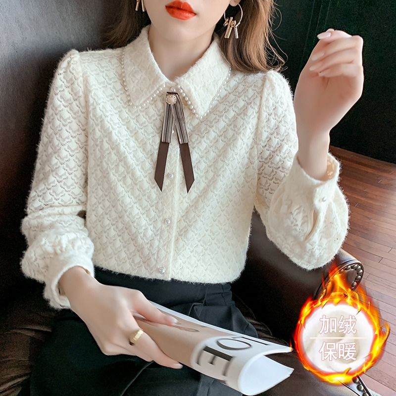加绒加厚蕾丝衫女秋冬新款洋气时尚磨毛打底衫气质衬衫显瘦上衣