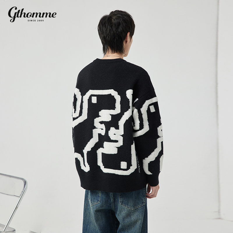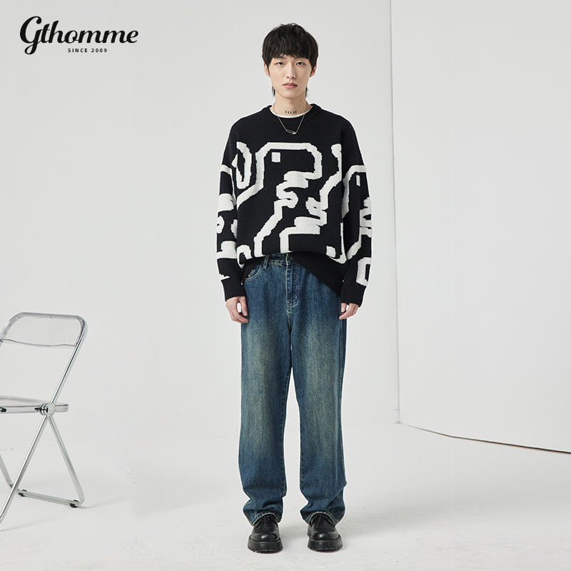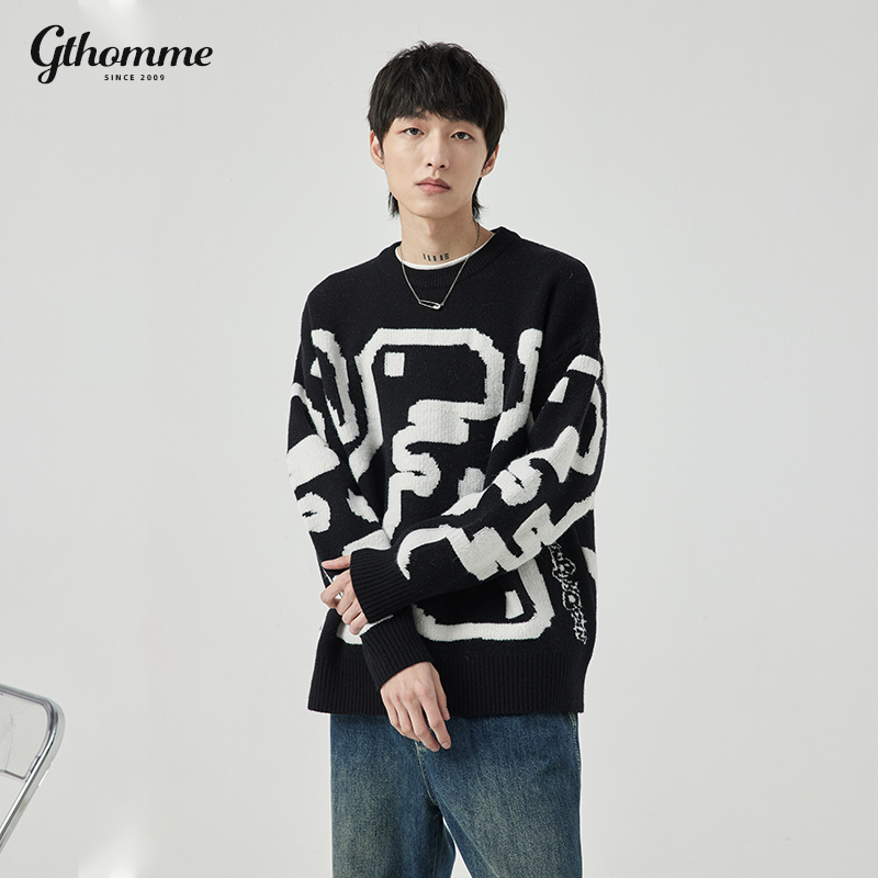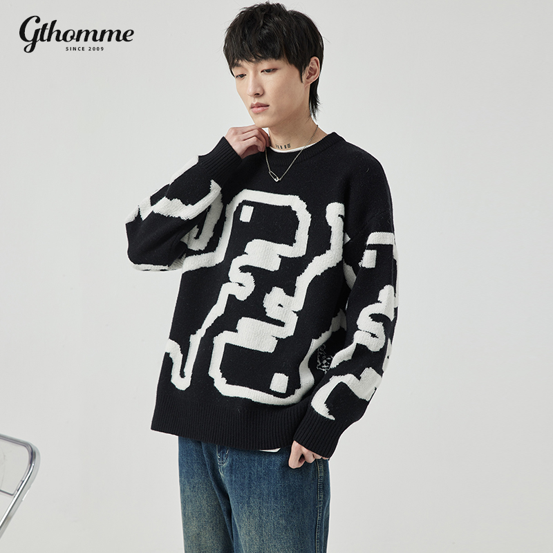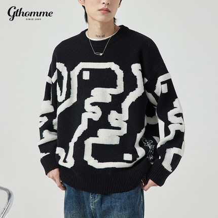 2025冬季新款毛衣男宽松圆领慵懒提花线衣潮流加厚青年针织衫男