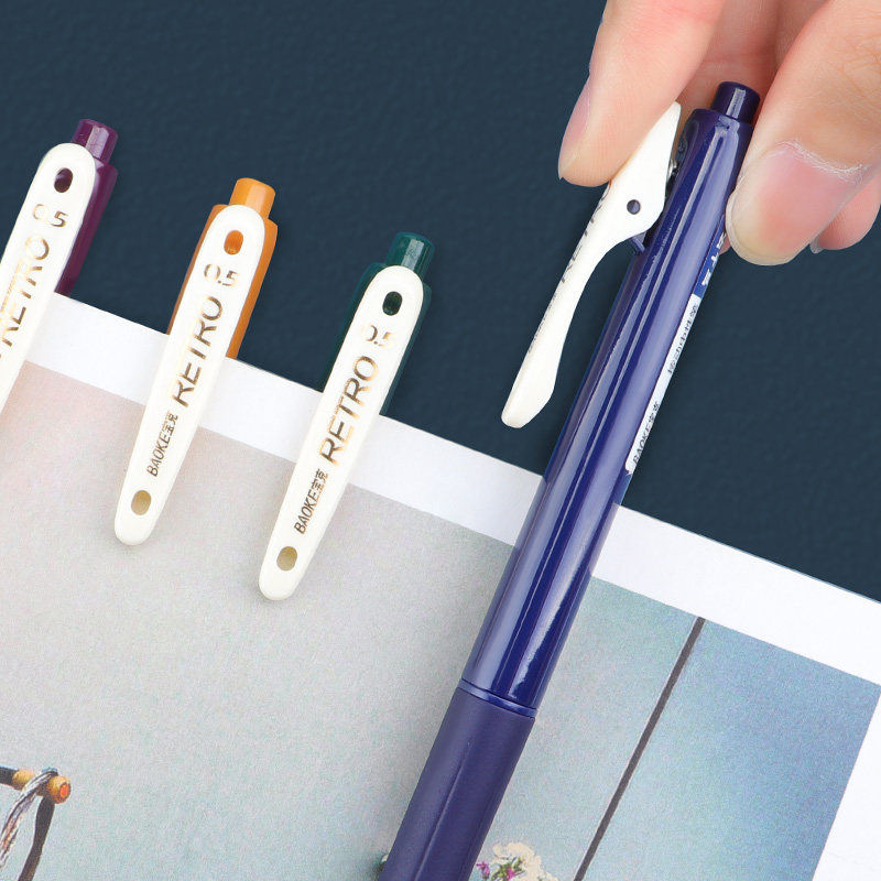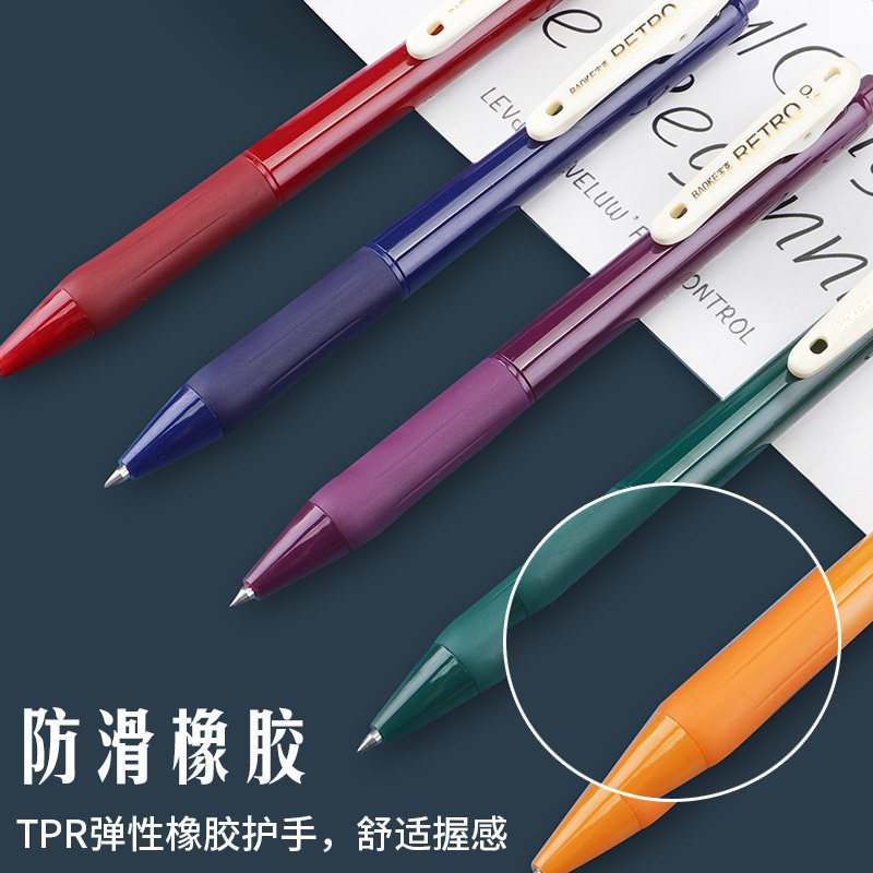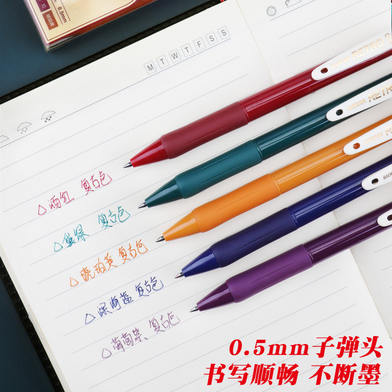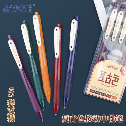 宝克复古色中性笔学生用彩色笔做笔记专用五色0.5mm按动笔高颜值ins冷淡风水笔中国风水笔手账笔简约韩版套装