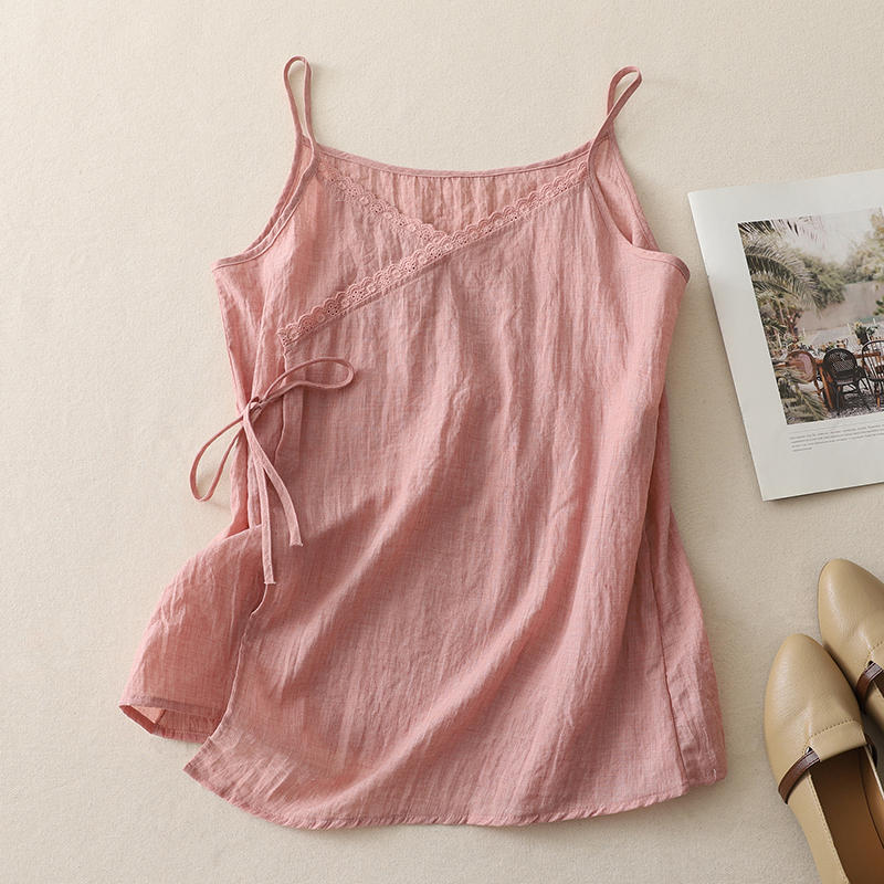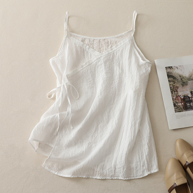文艺蕾丝花边背心女宽松夏斜襟棉麻风系带内搭外穿吊带衫