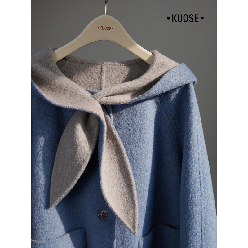 阔色短款羊毛连帽双面毛呢外套女25秋冬季新款设计感蓝色呢子大衣
