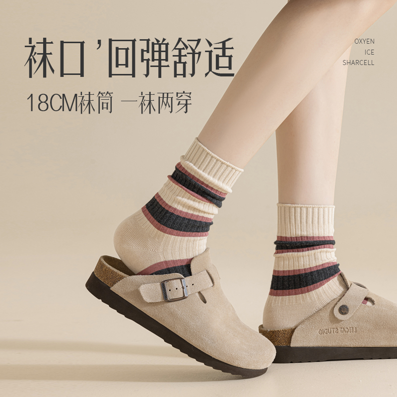 袜子女纯棉中筒袜秋冬2025新款爆款网红ins长筒条纹堆堆黑色长袜