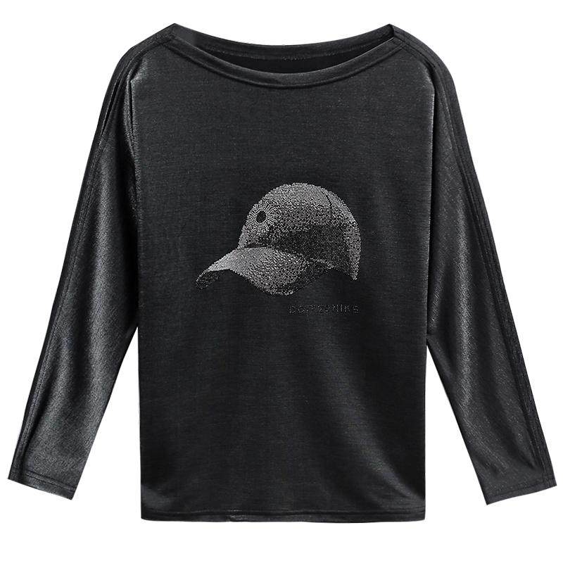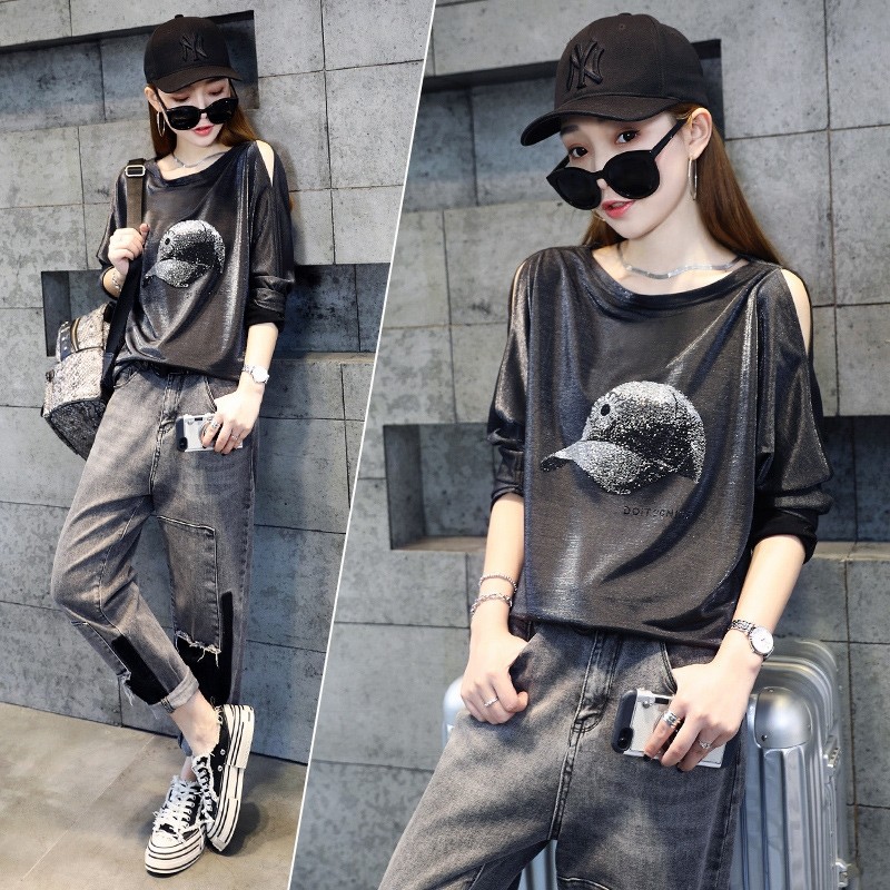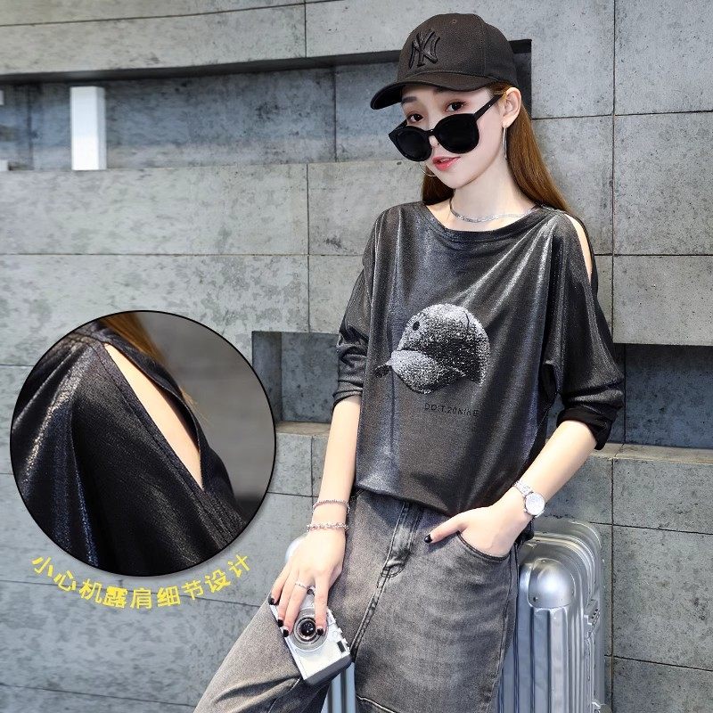 欧洲站早秋新款2025休闲洋气长袖t恤女宽松露肩时尚烫钻春秋上衣