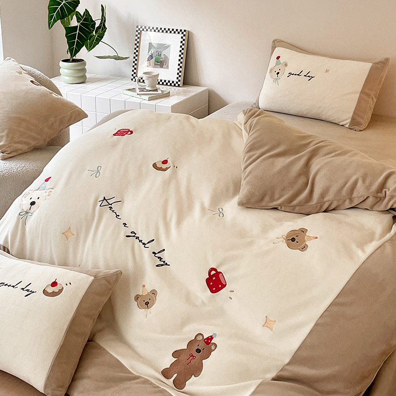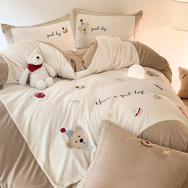 冬季儿童保暖牛奶绒四件套卡通风刺绣加厚珊瑚绒被套床品咖色1.2