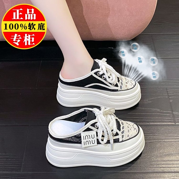 品牌真皮包头半拖鞋女2025夏新款厚底增高蕾丝网面透气休闲凉拖鞋