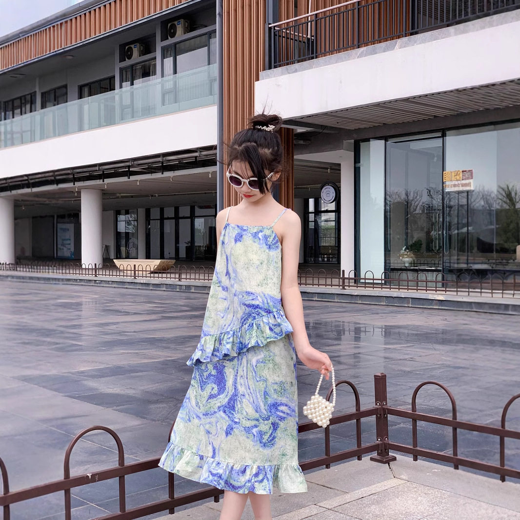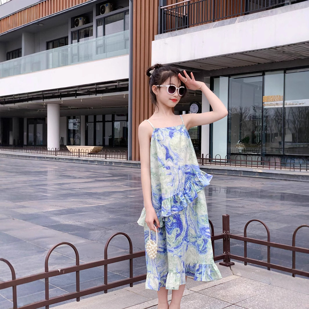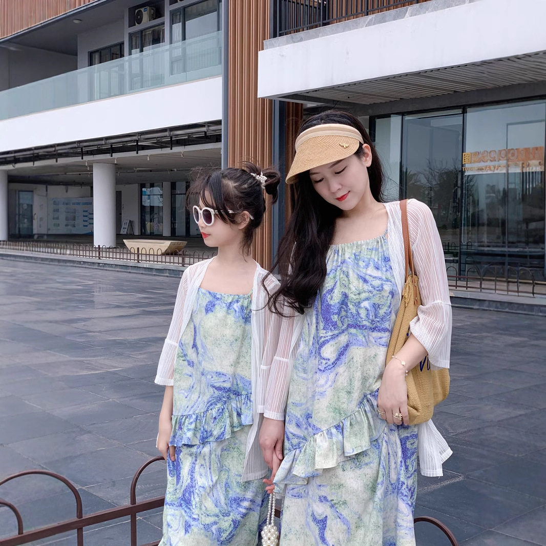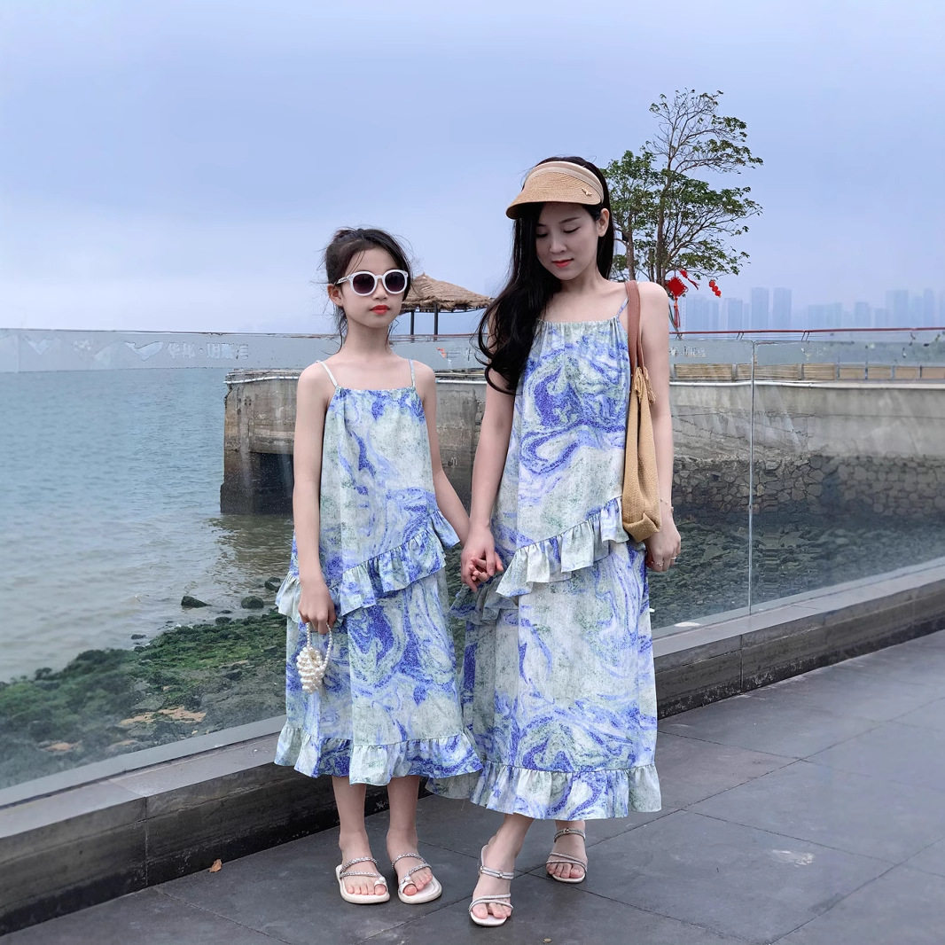 海边度假2025新款亲子装母女装法式浪漫油画吊带连衣裙夏威夷长裙