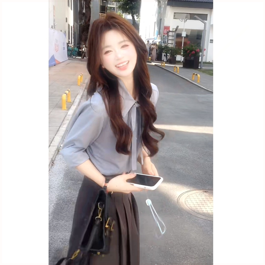 工作室原创法式气质蓝色长袖polo裙领衬衫蝴蝶结百搭上衣高腰百褶