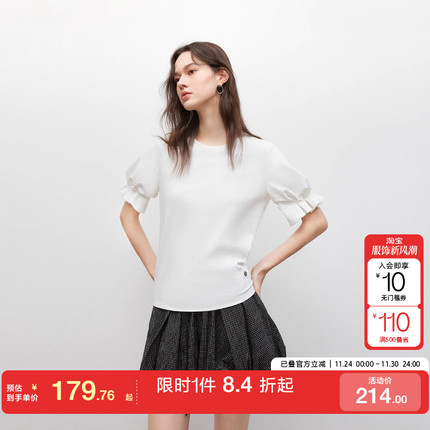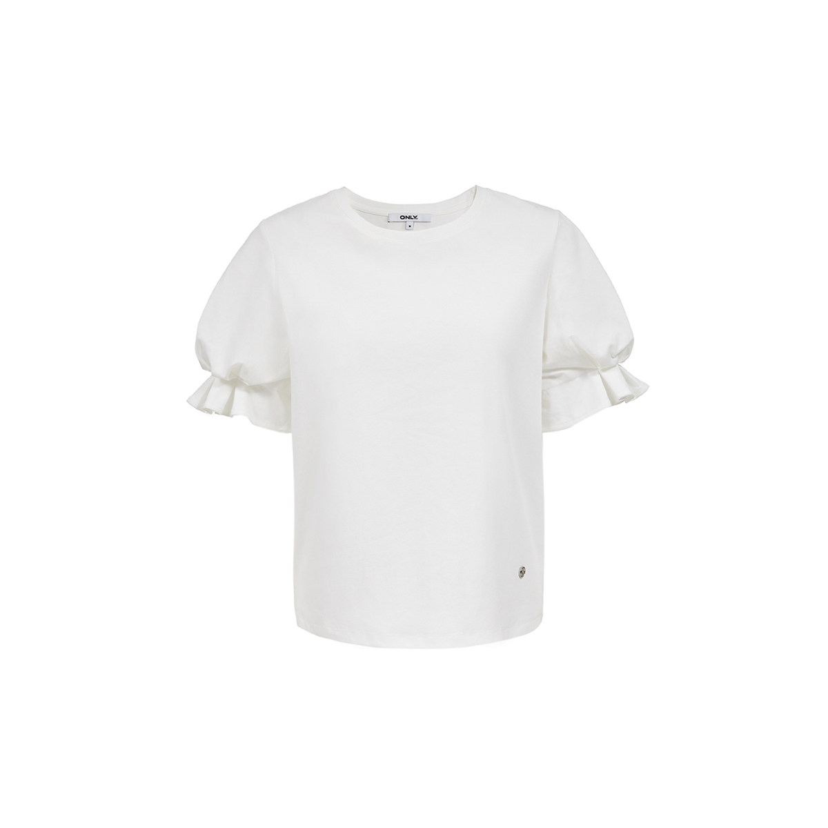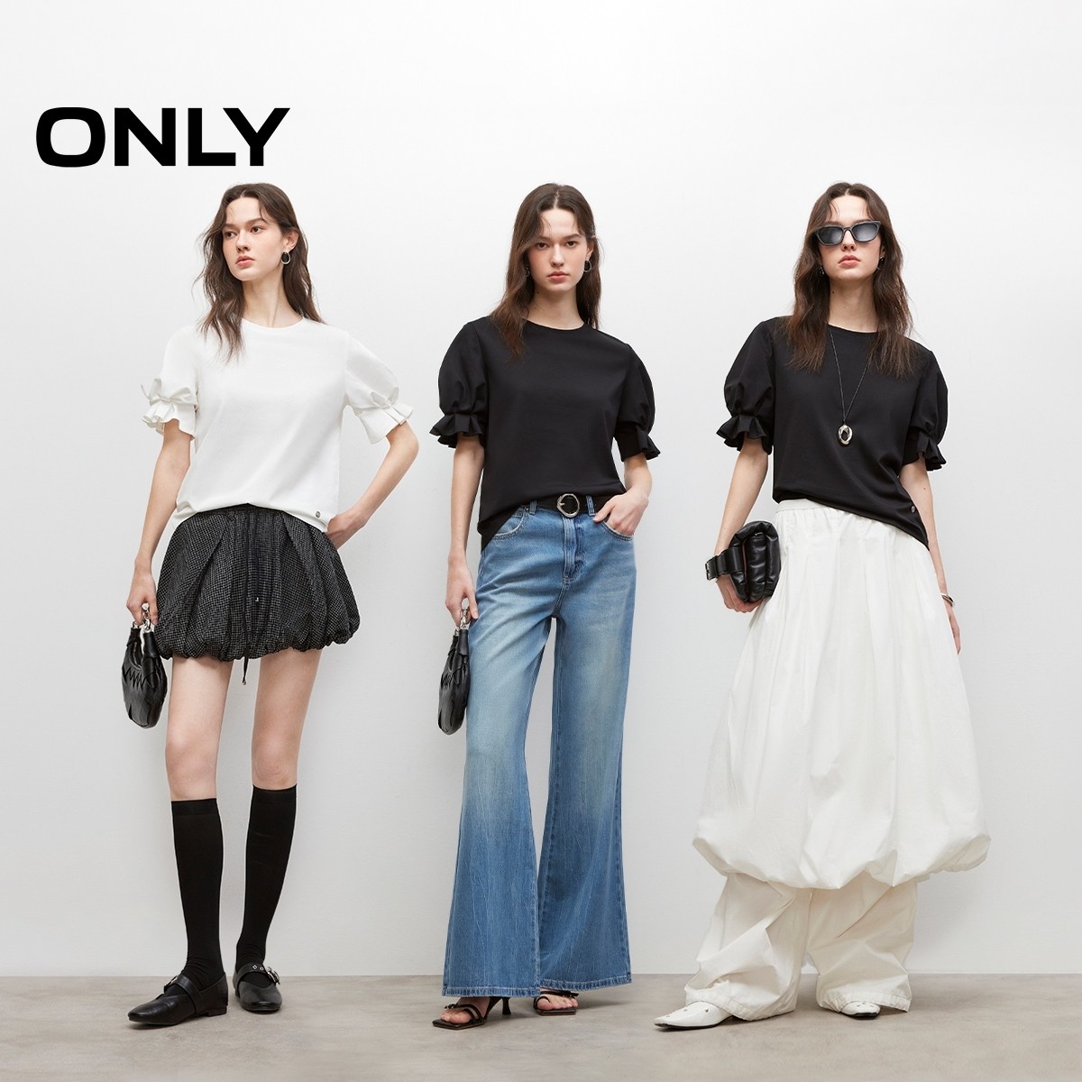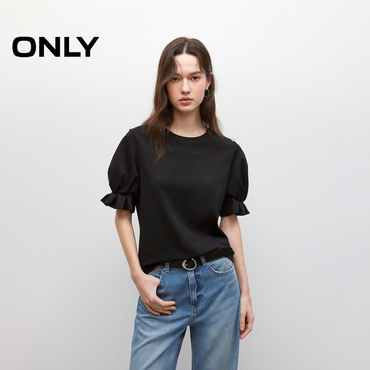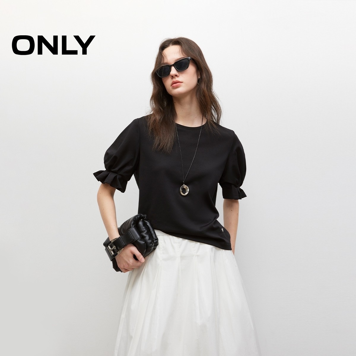 绫致ONLY2025夏季新款舒适正肩圆领泡泡袖纯色短袖T恤女