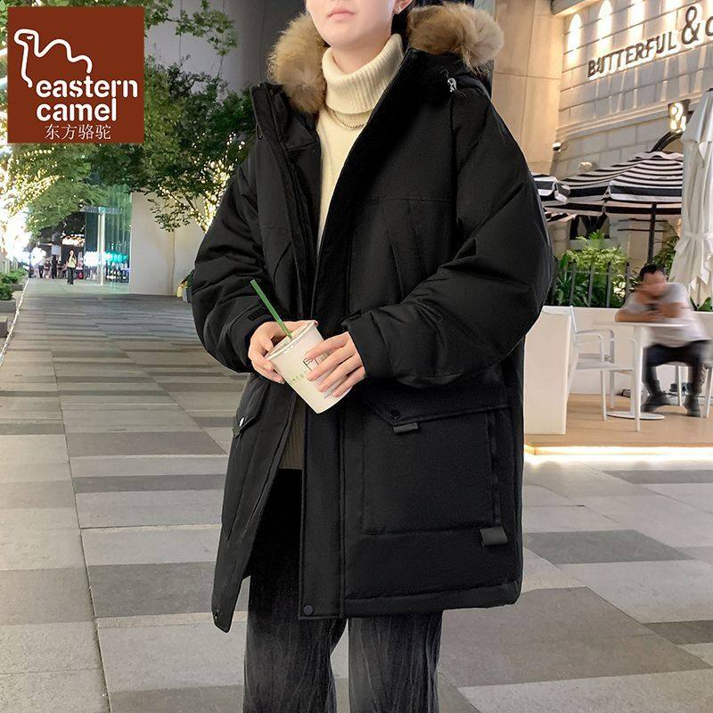 东方骆驼工装羽绒服男冬中长款连帽青少年大毛领加厚高端防寒外套