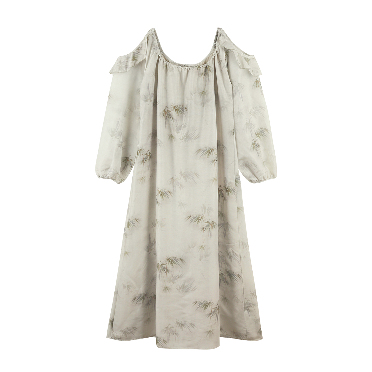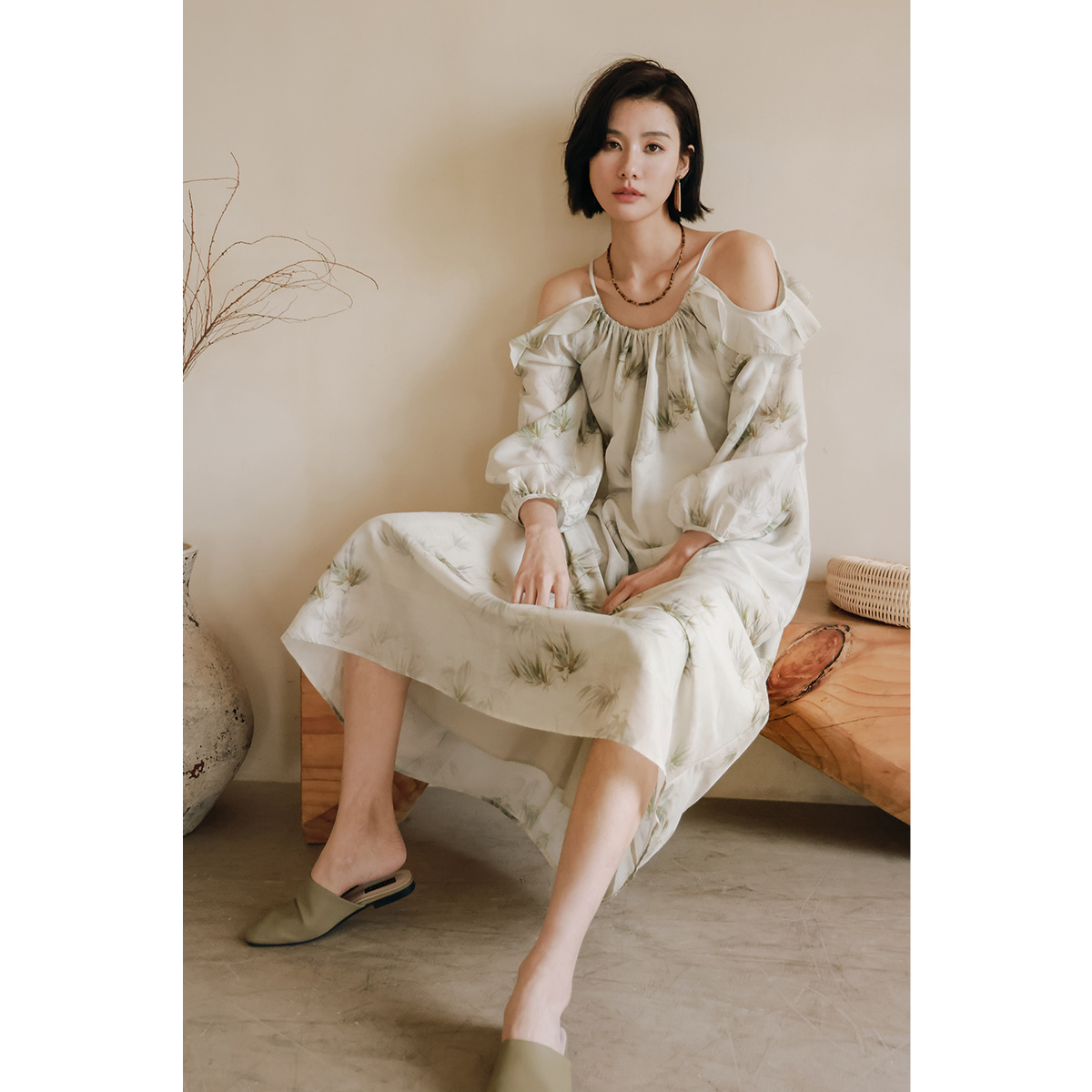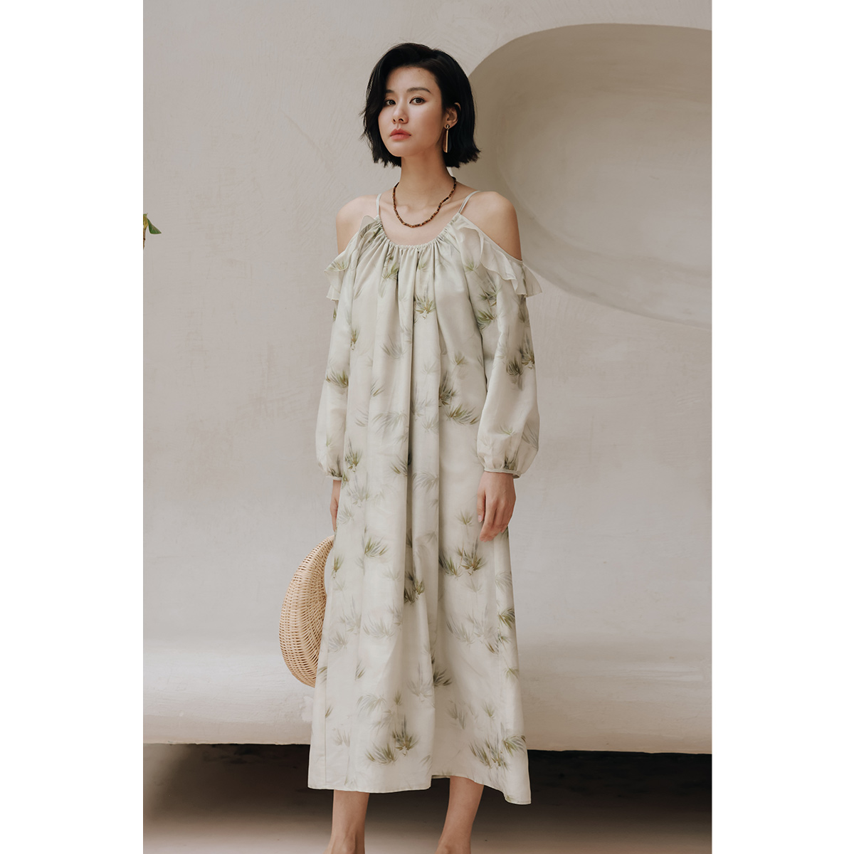 弥古露肩碎花连衣裙早春新款女长袖宽松雪纺吊带裙海边度假沙滩裙
