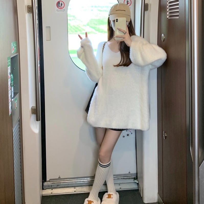 白色温柔风露肩长袖毛衣女装秋季软糯糯针织衫中长款慵懒宽松上衣