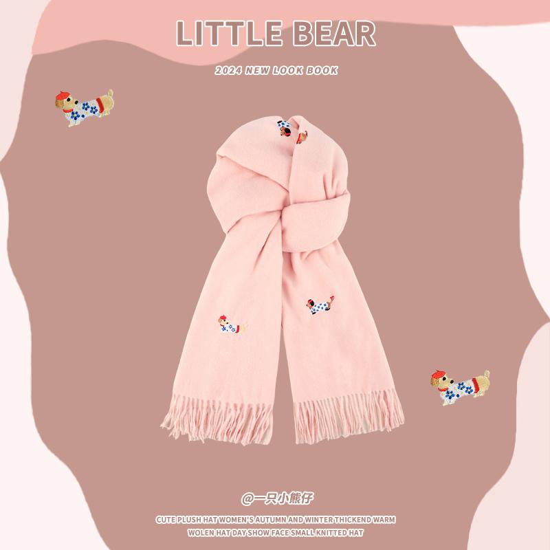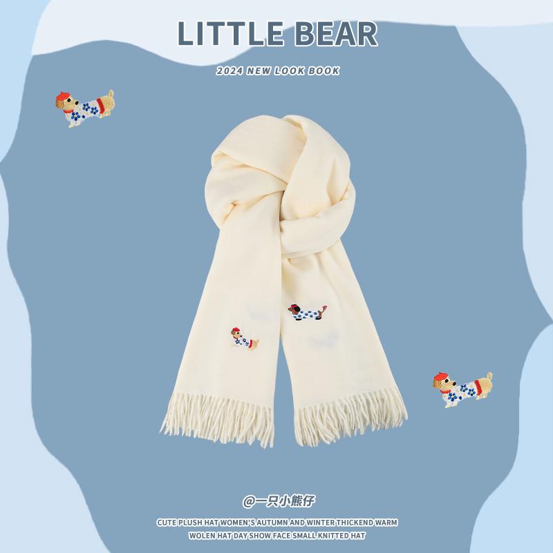 腊肠狗刺绣仿羊绒蓝色围巾女秋冬季防寒保暖学生流苏围脖2024新款