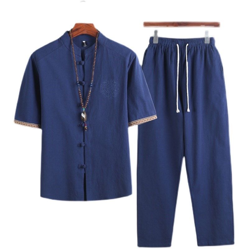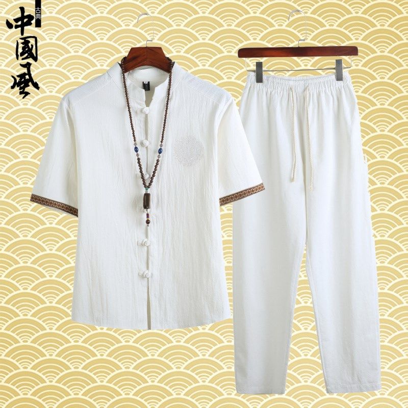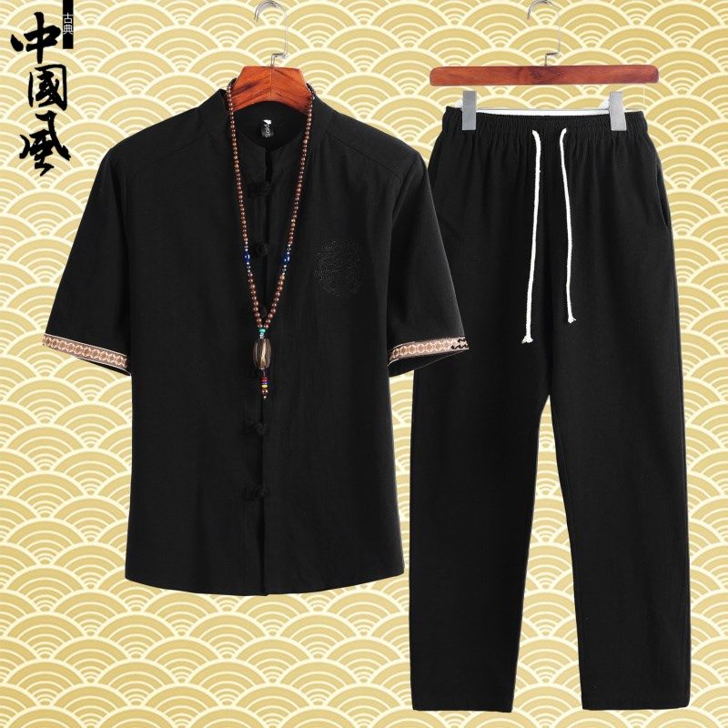 夏季唐装亚麻布短袖衬衫中老年爸爸装父亲节休闲男棉麻料长裤套装