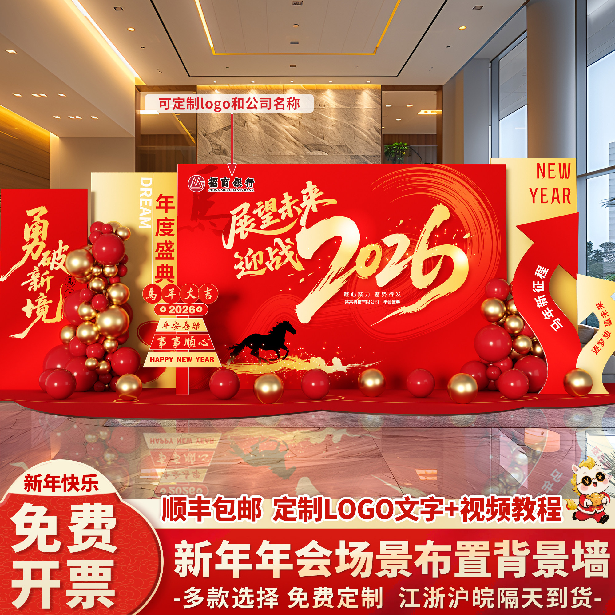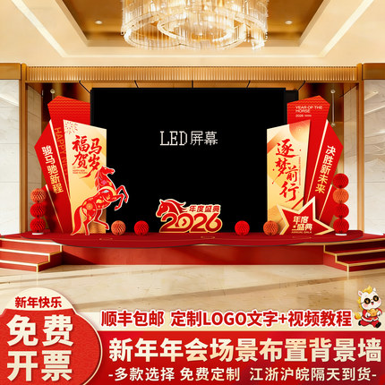 2026公司年会LED两侧场景氛围布置新马年装饰现场舞台背景墙kt板