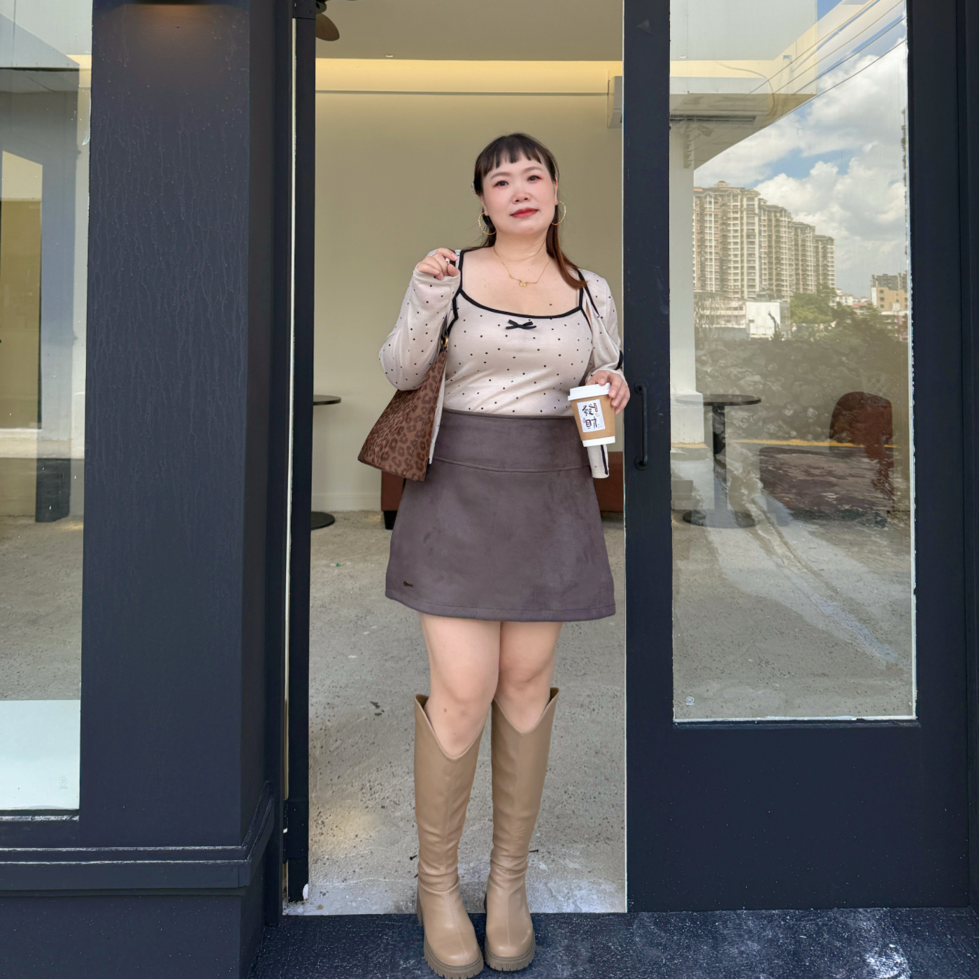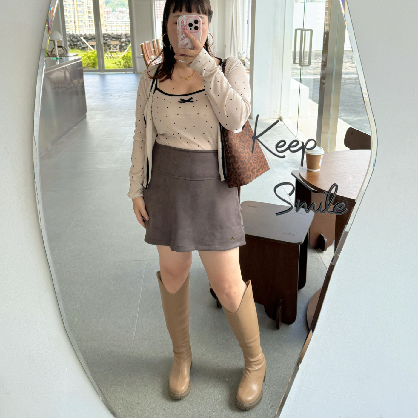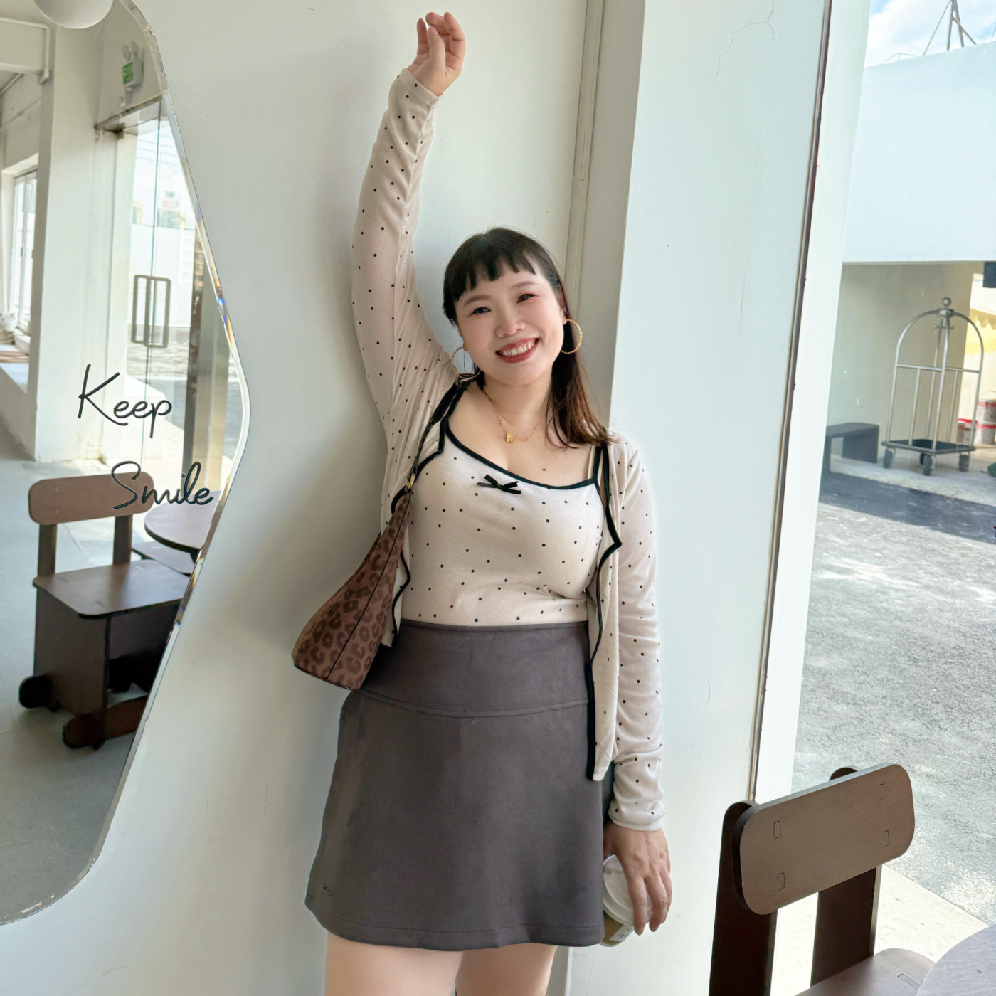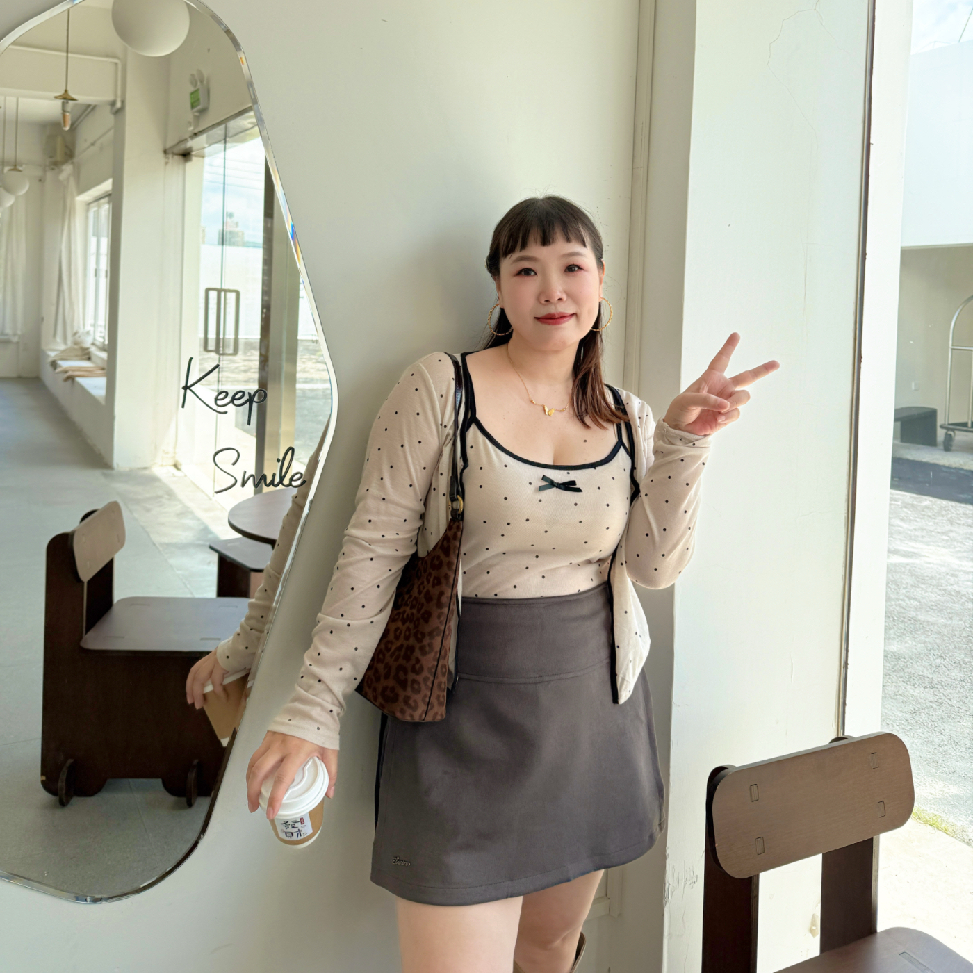 大码奶茶色法式小波点蝴蝶结吊带开衫套装慵懒风时髦两件套